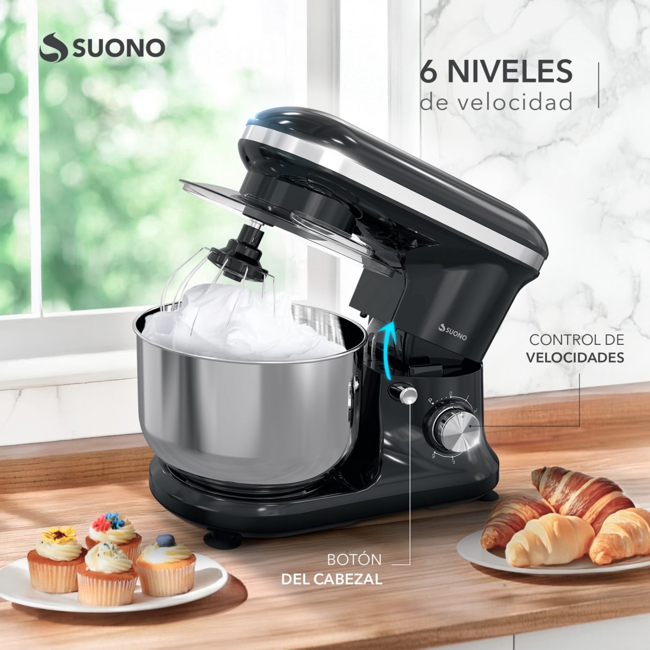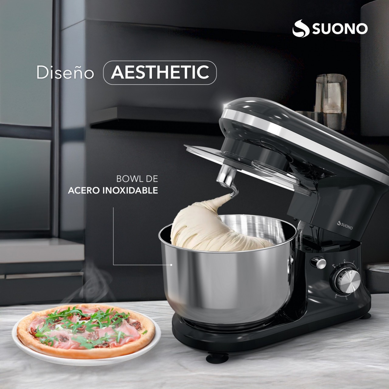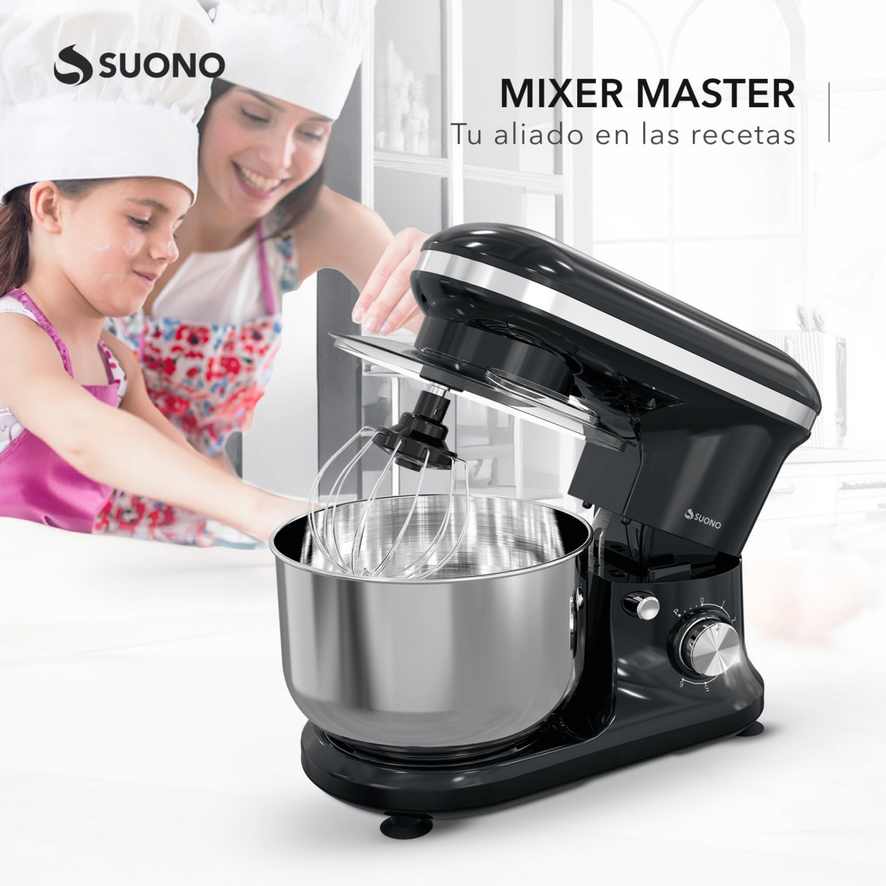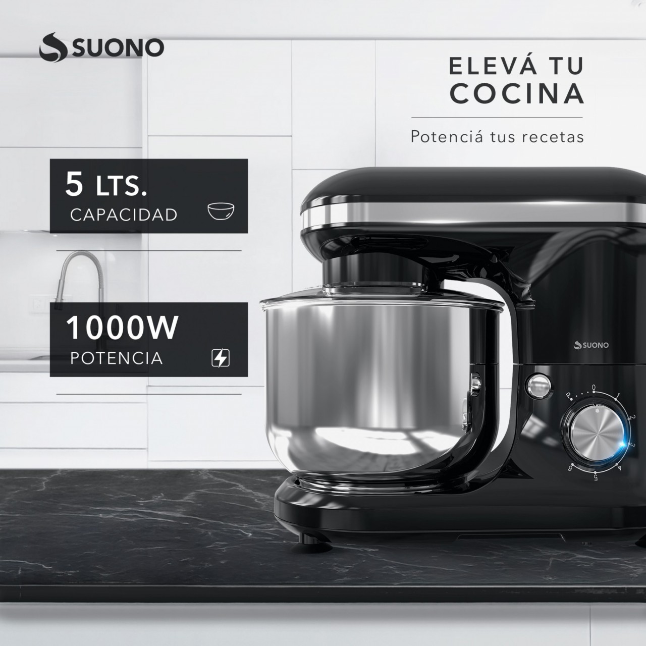 Batidora planetaria Suono de 1000W. Bowl de acero inoxidable de 5 litros. Incluye accesorios para batir y amasar.