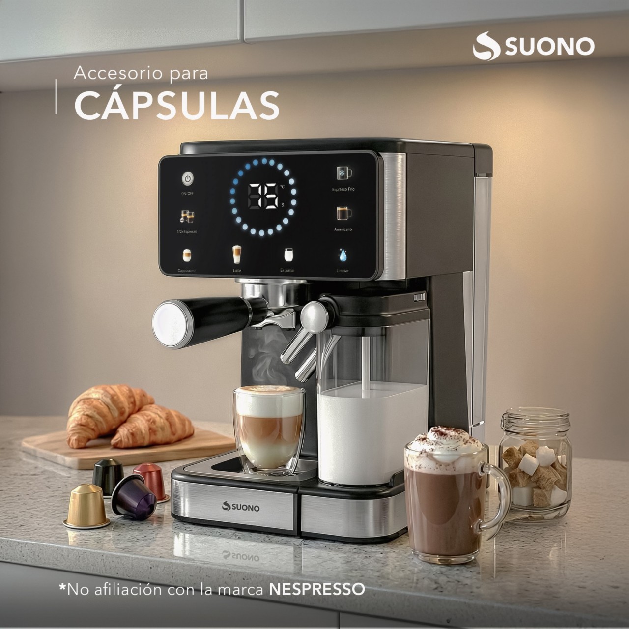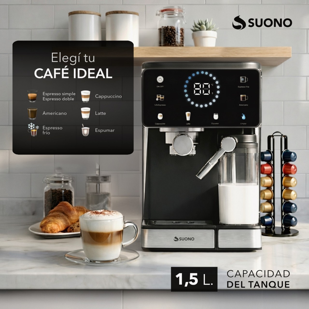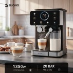 Cafetera espresso digital. Permite preparar café intenso en casa. Diseño moderno y fácil de usar.