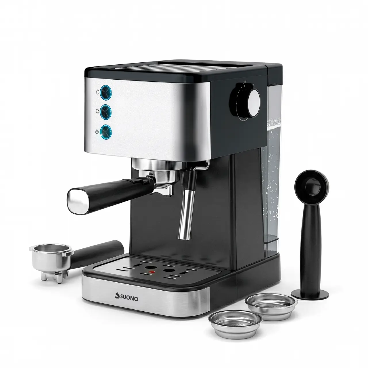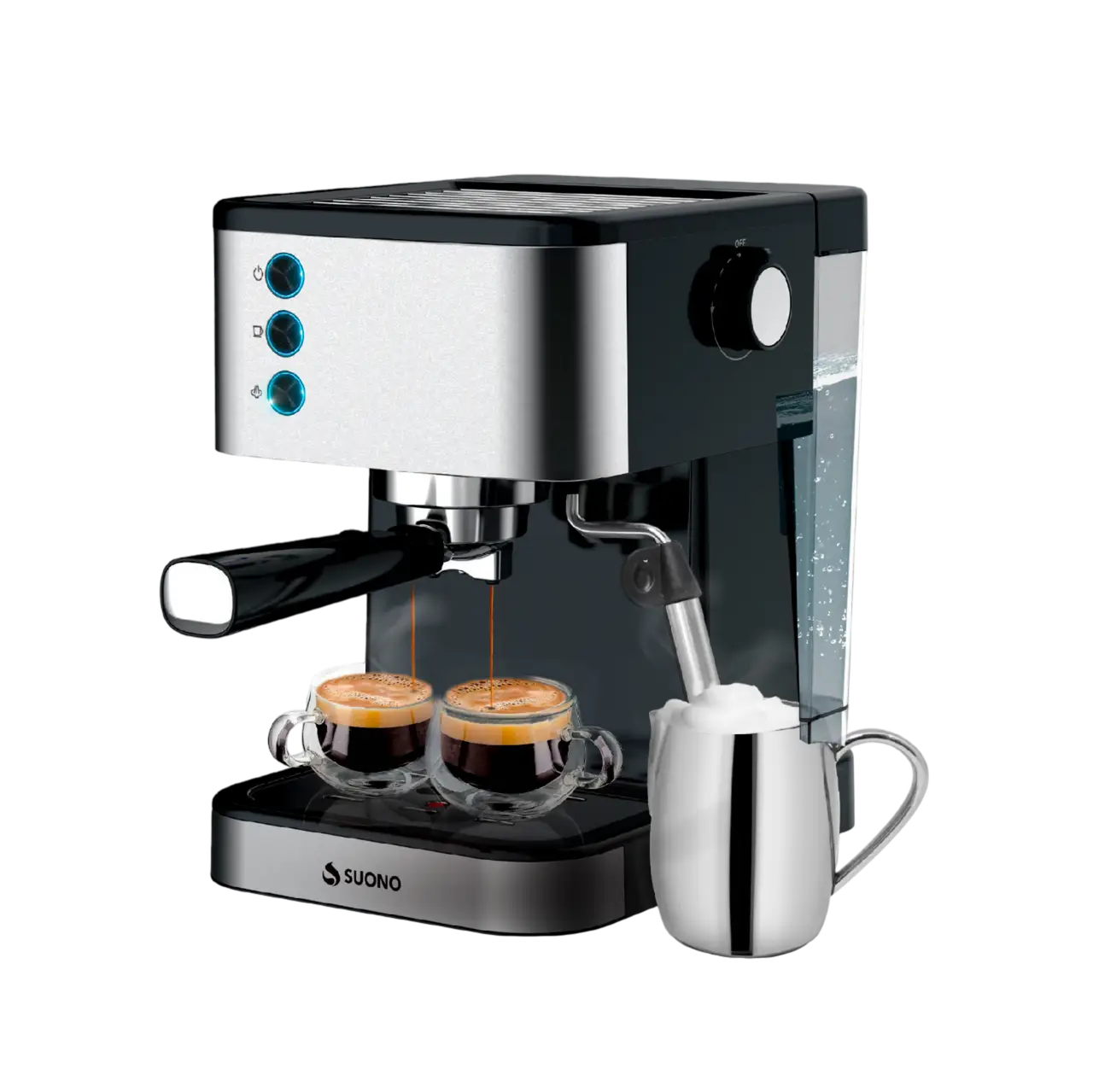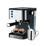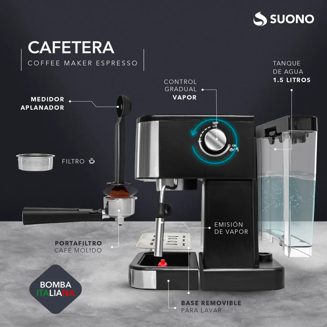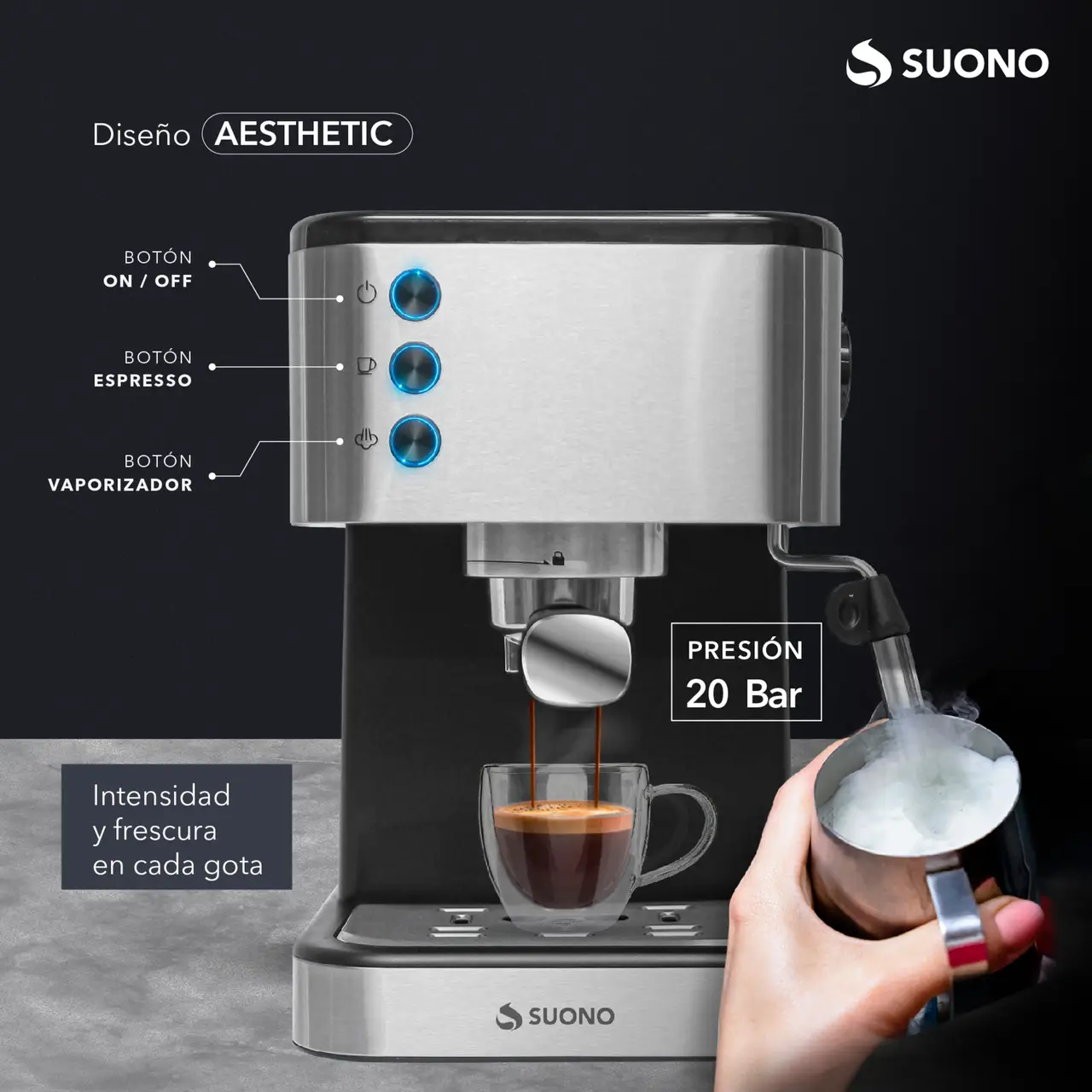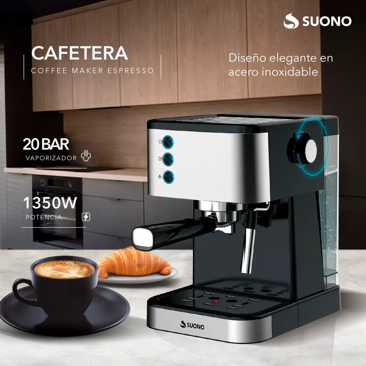 Cafetera espresso de 1350W. Presión de 20 bar para extracción perfecta. Permite preparar dos tazas simultáneamente.