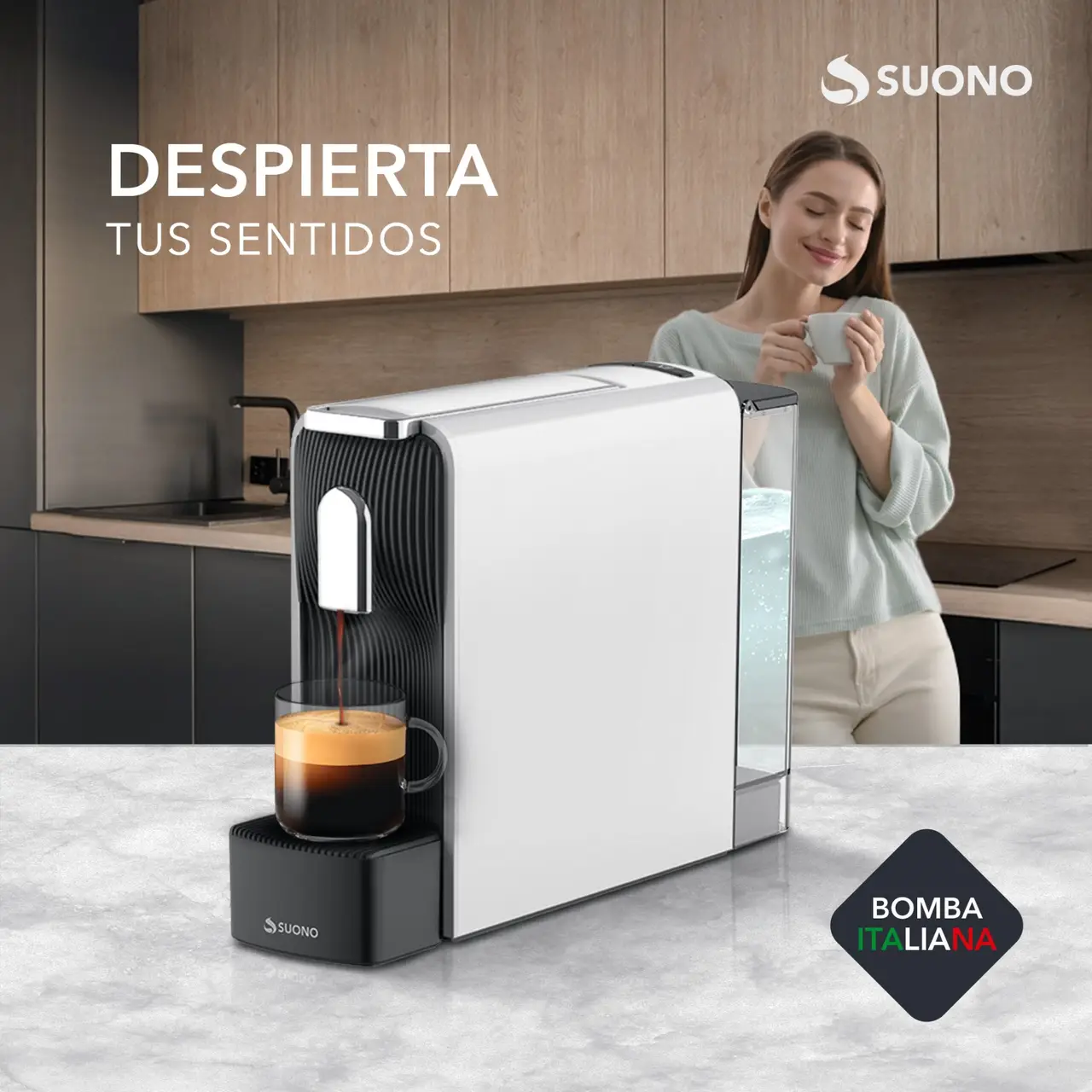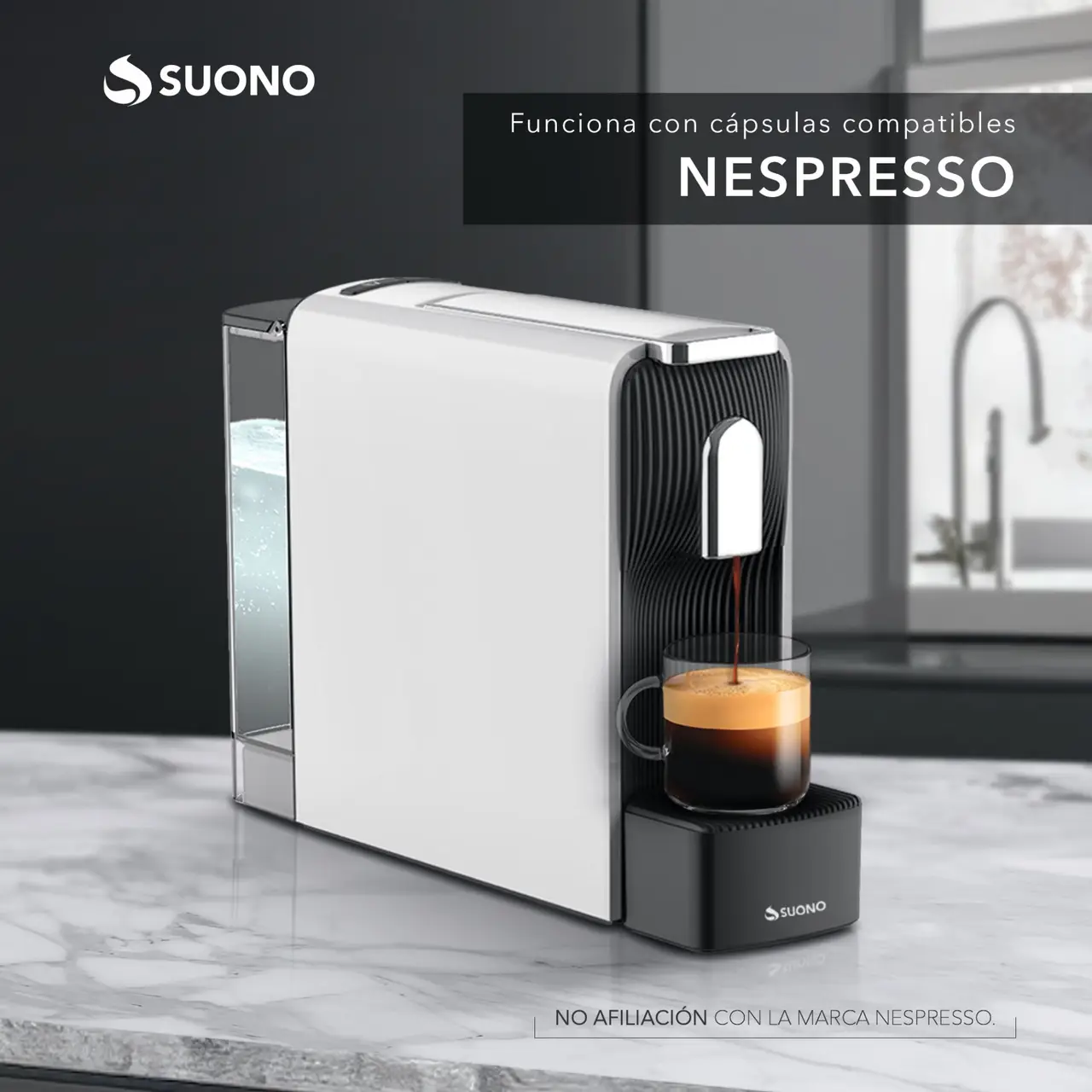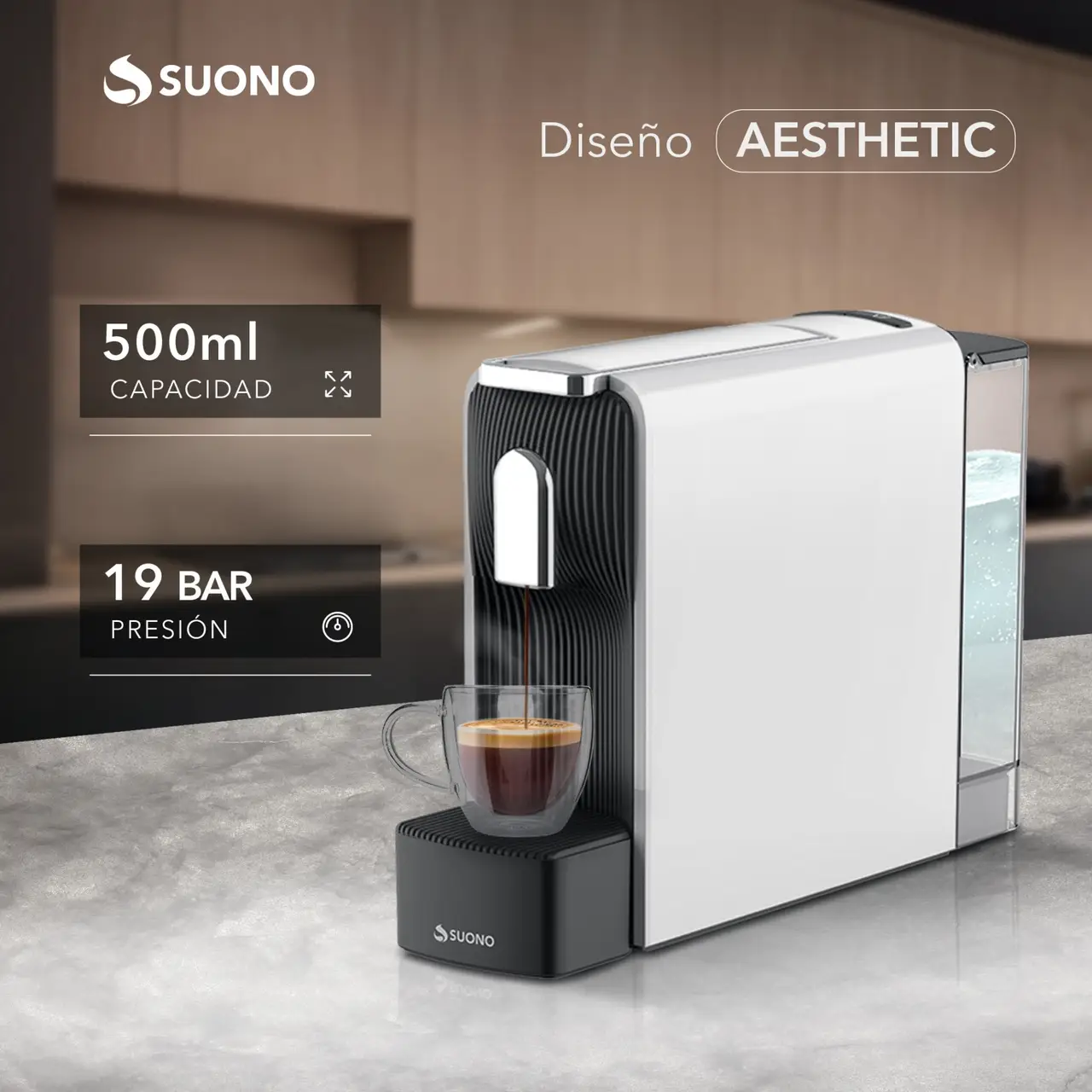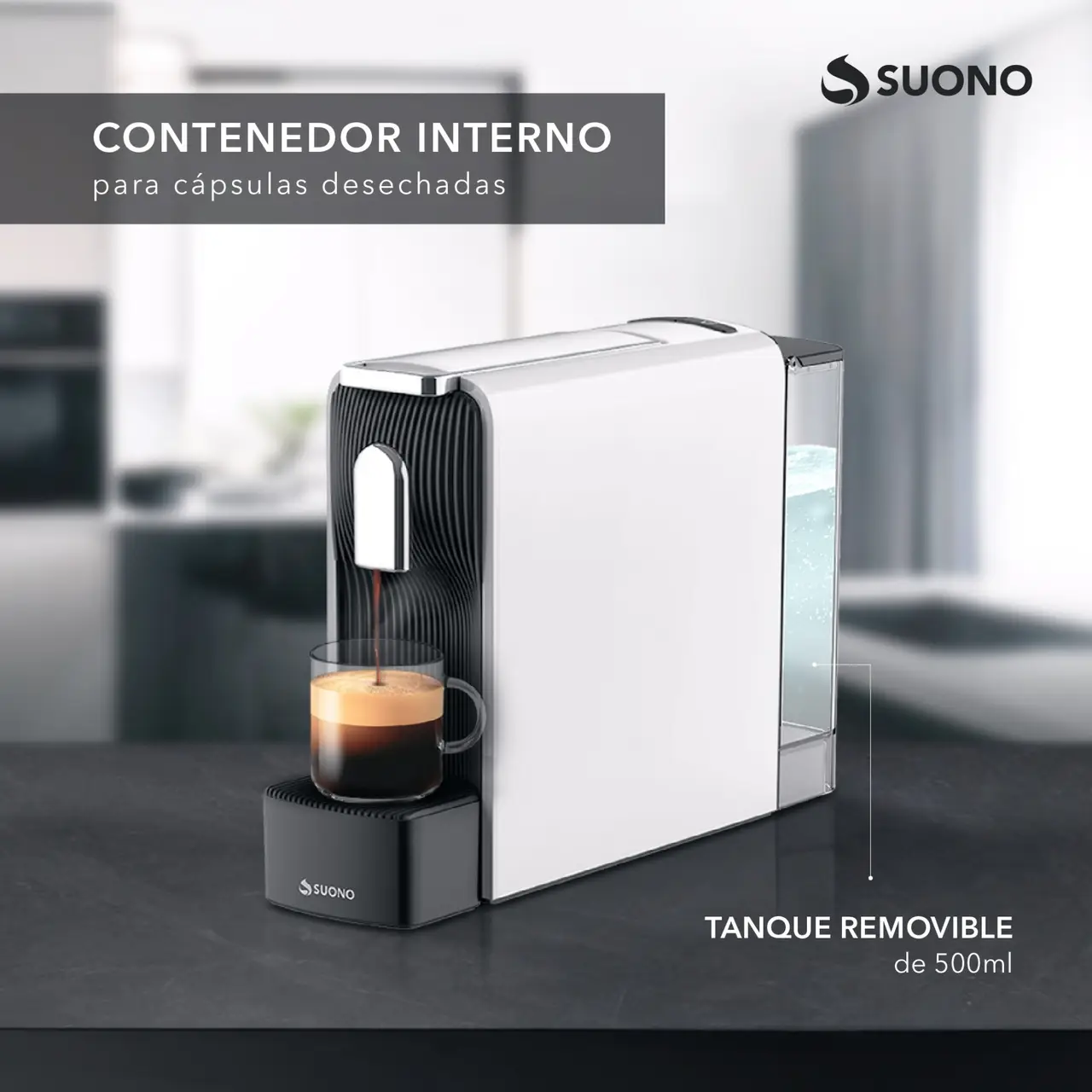 Cafetera espresso compacta para cápsulas. Capacidad de 500 ml. Diseño elegante y práctico.