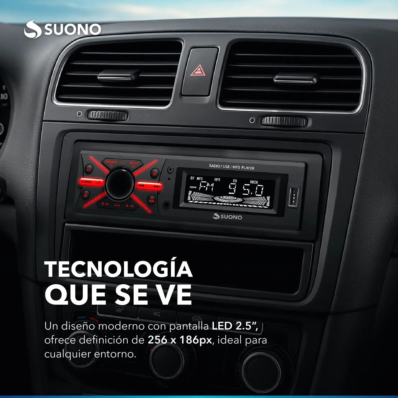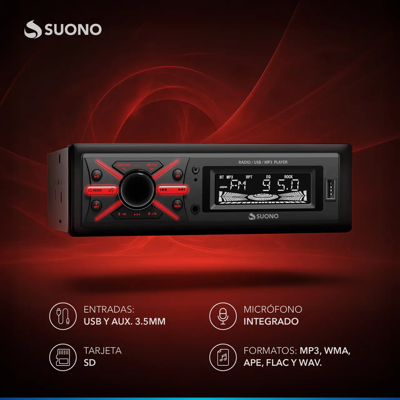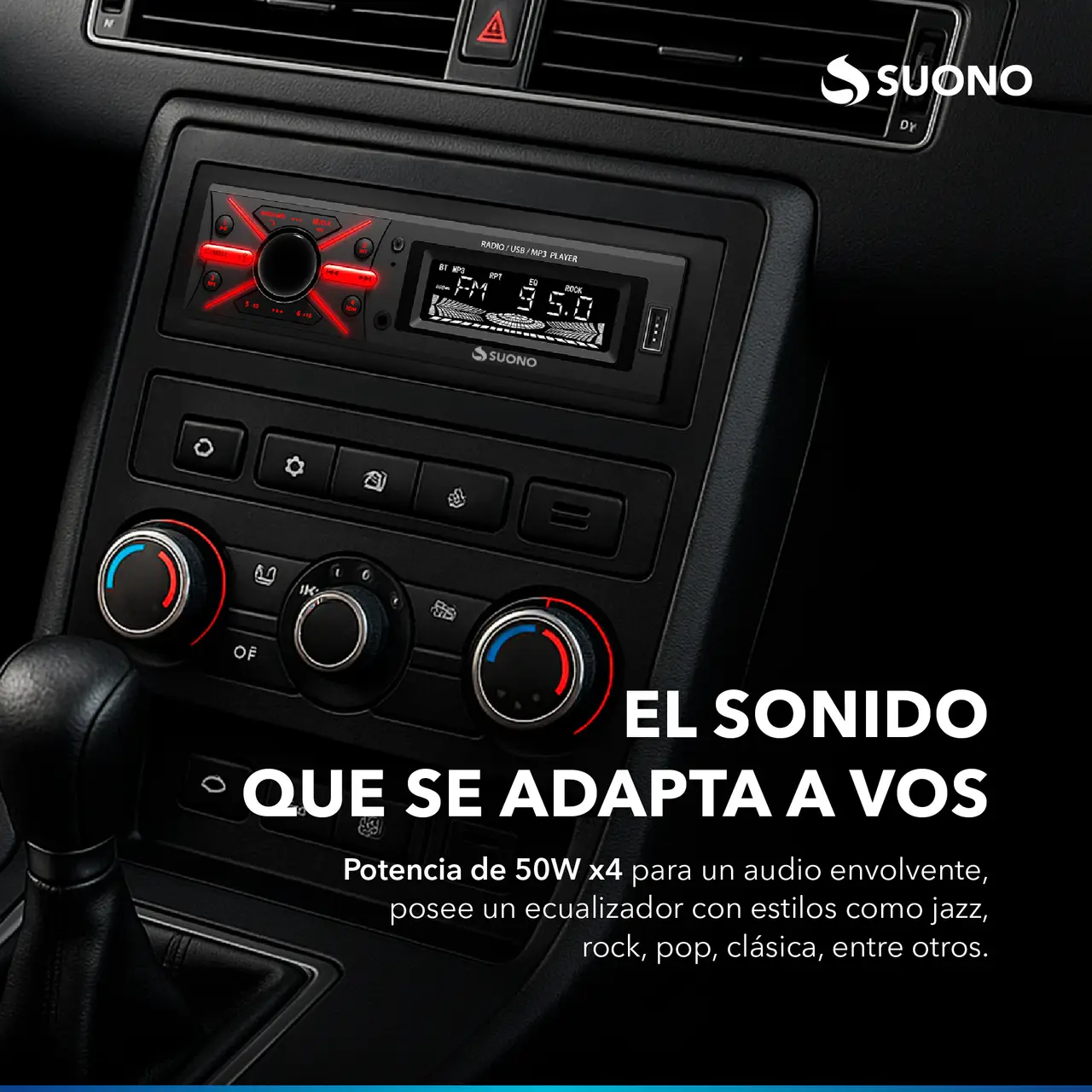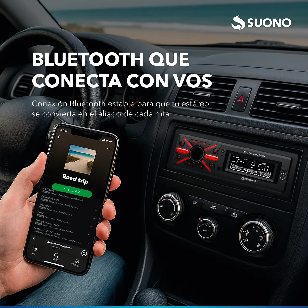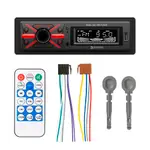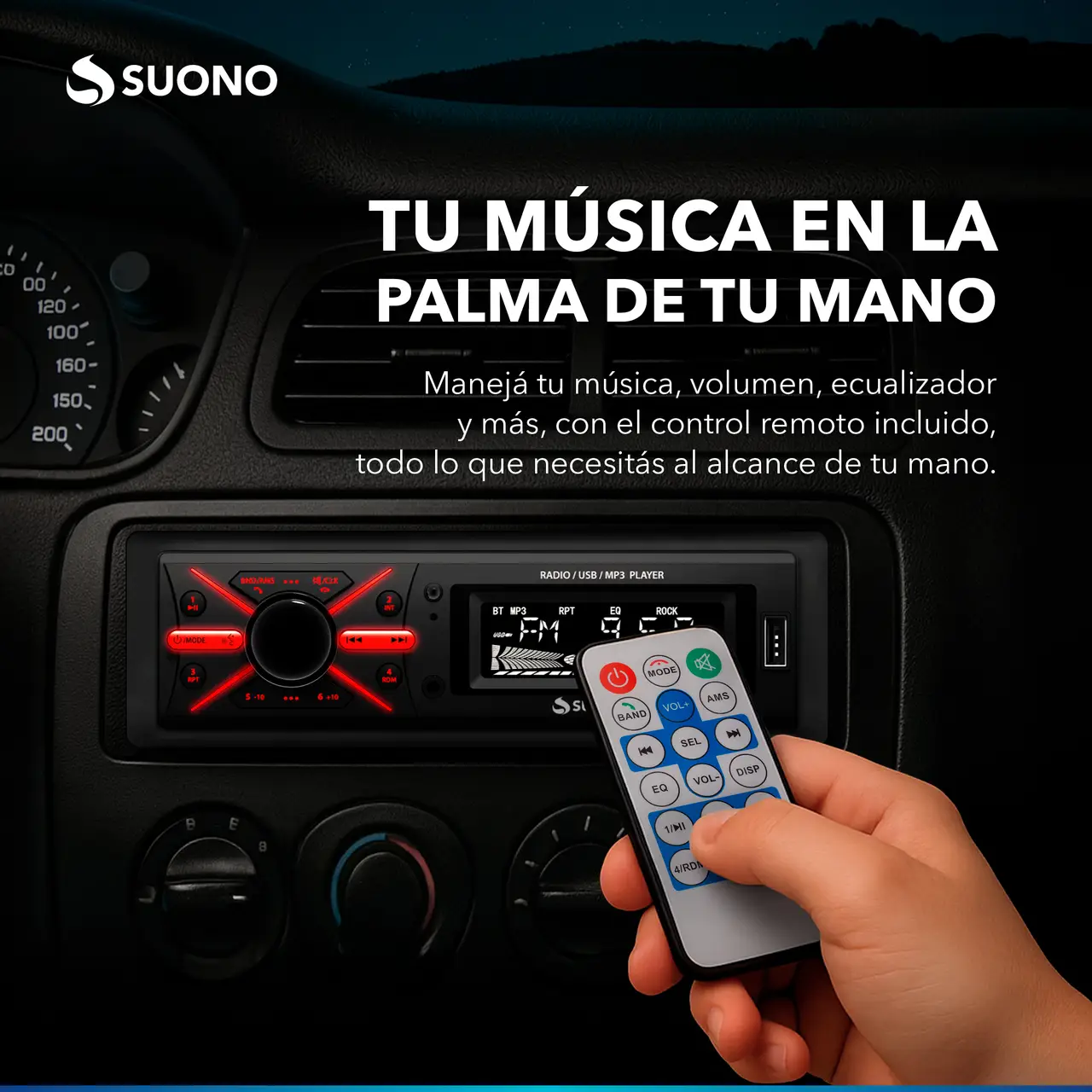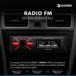 Estéreo desmontable para auto con Bluetooth, USB, MP3 y radio FM. Incluye control remoto para mayor comodidad.
