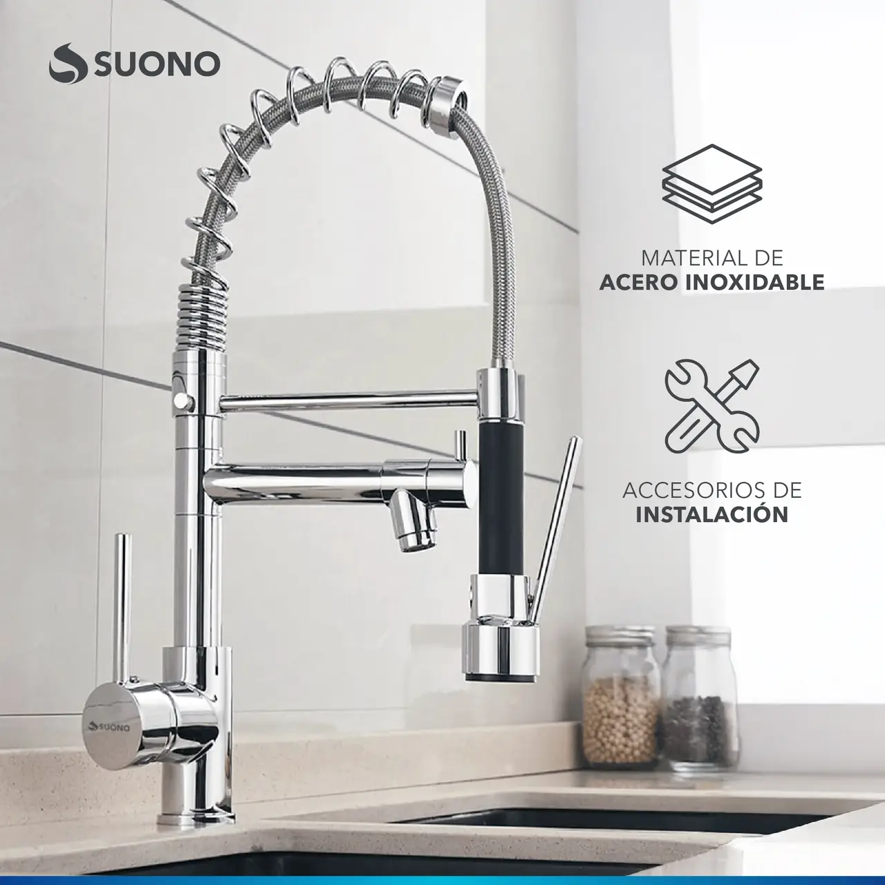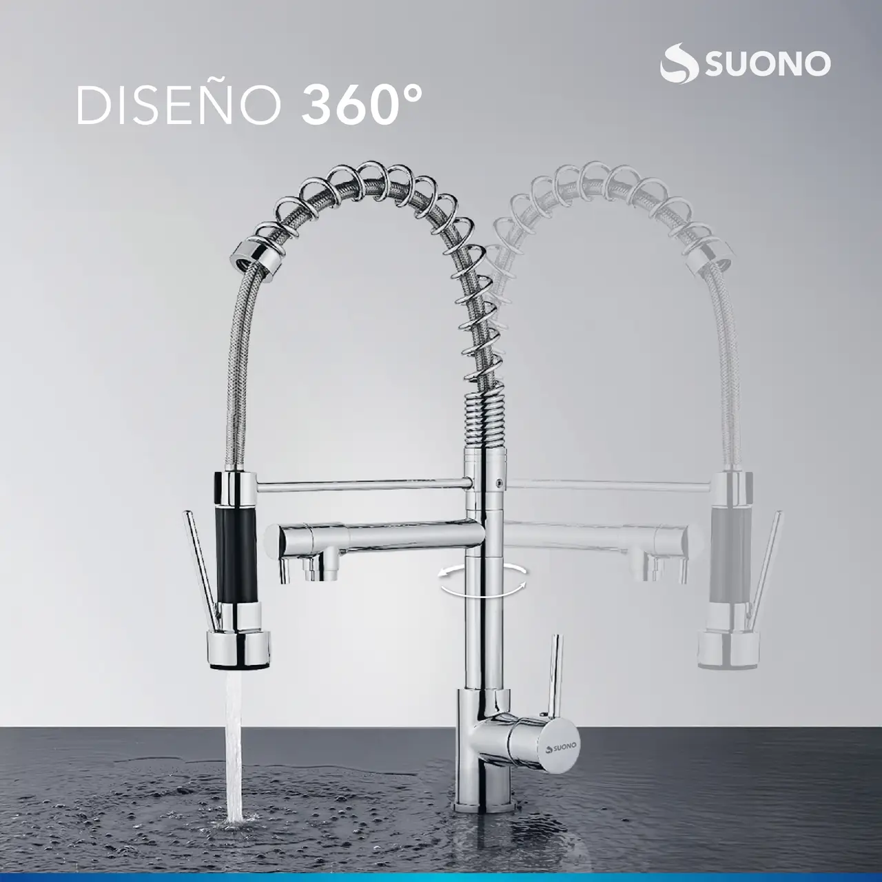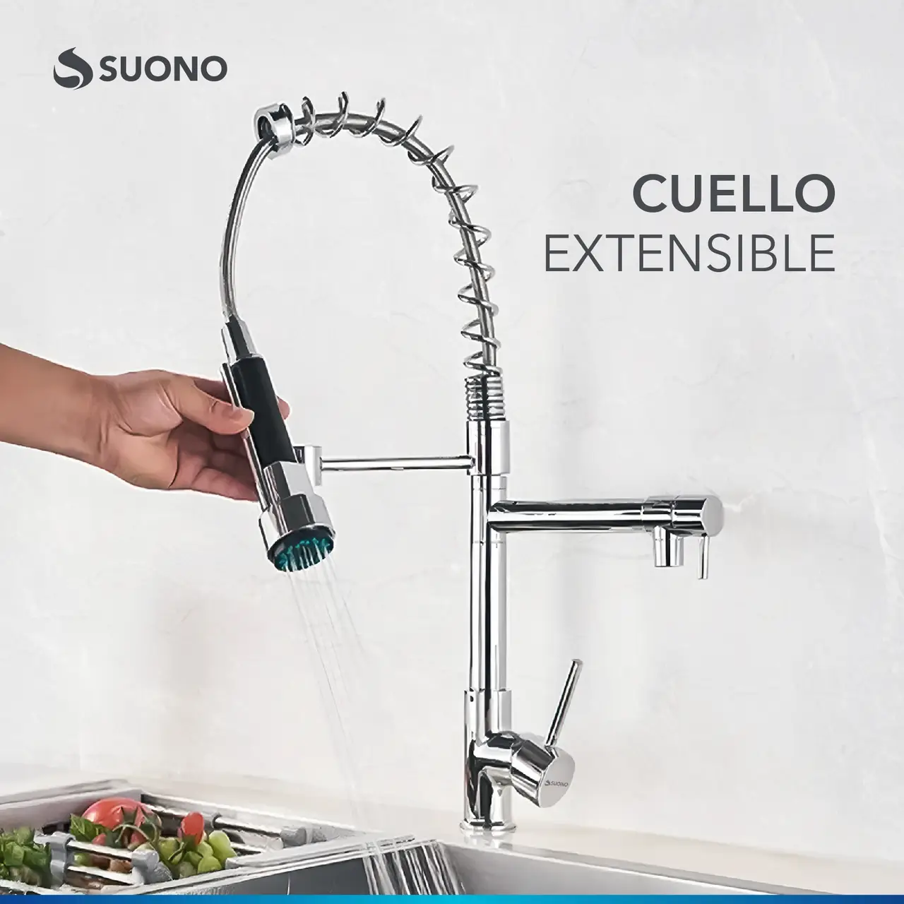 Canilla de cocina extensible con doble salida de agua. Diseño funcional y moderno.