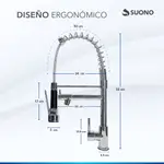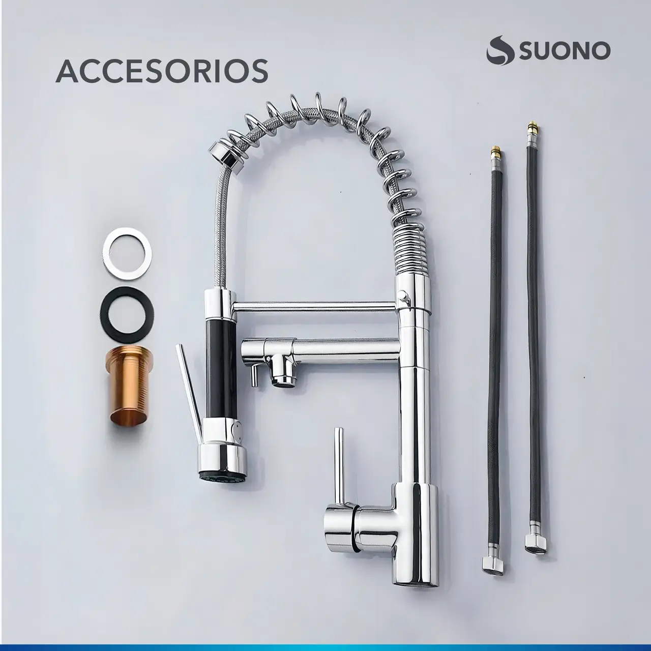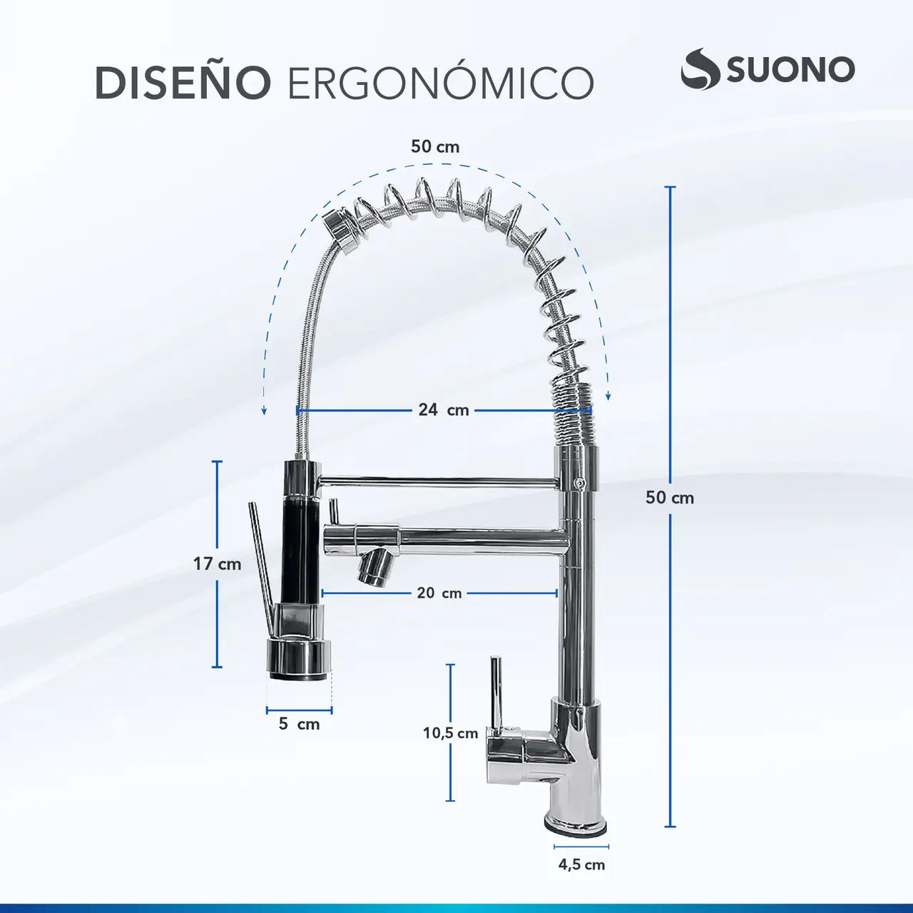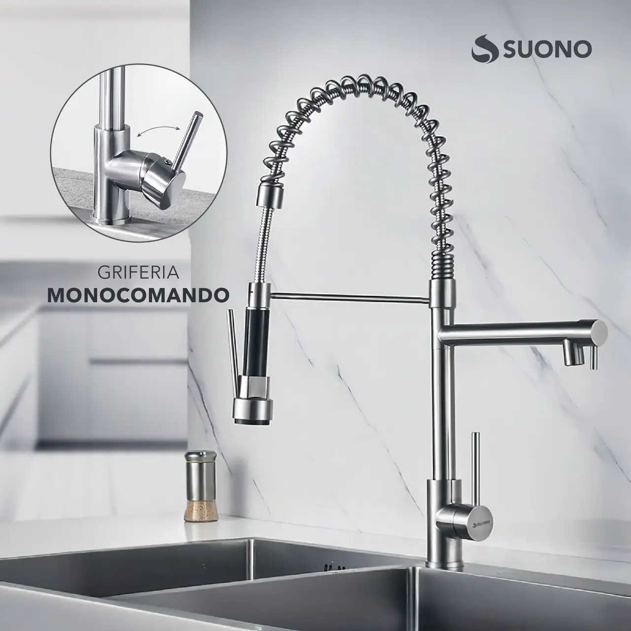 Canilla de cocina extensible con doble salida de agua. Diseño funcional y moderno.