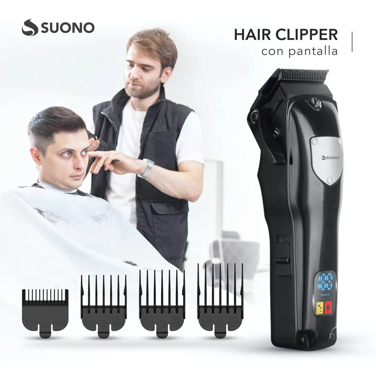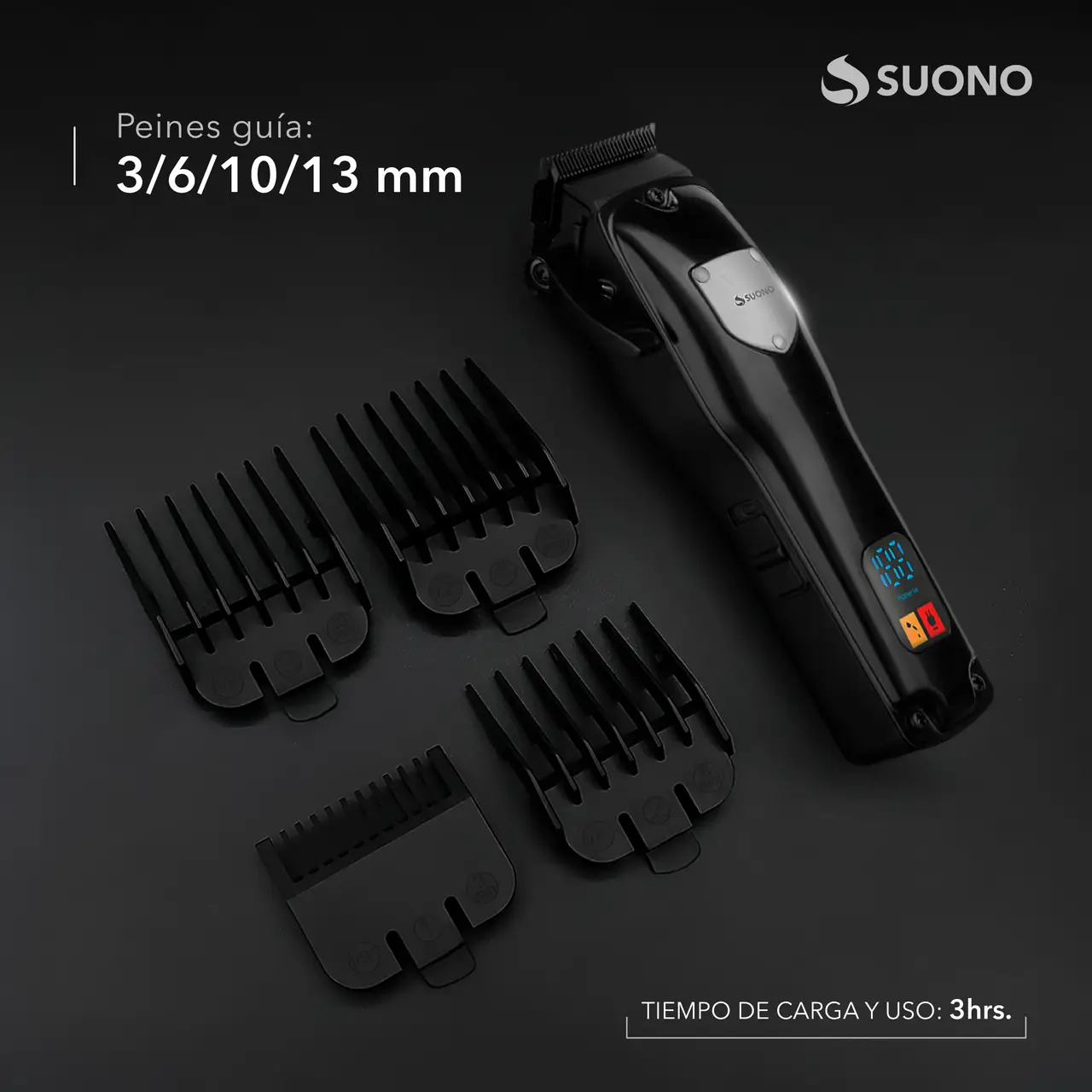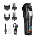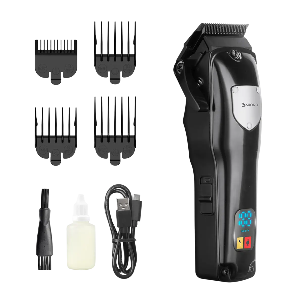 Máquina cortapelos con pantalla LED y cuchillas de acero inoxidable. Incluye peines guía y batería recargable.