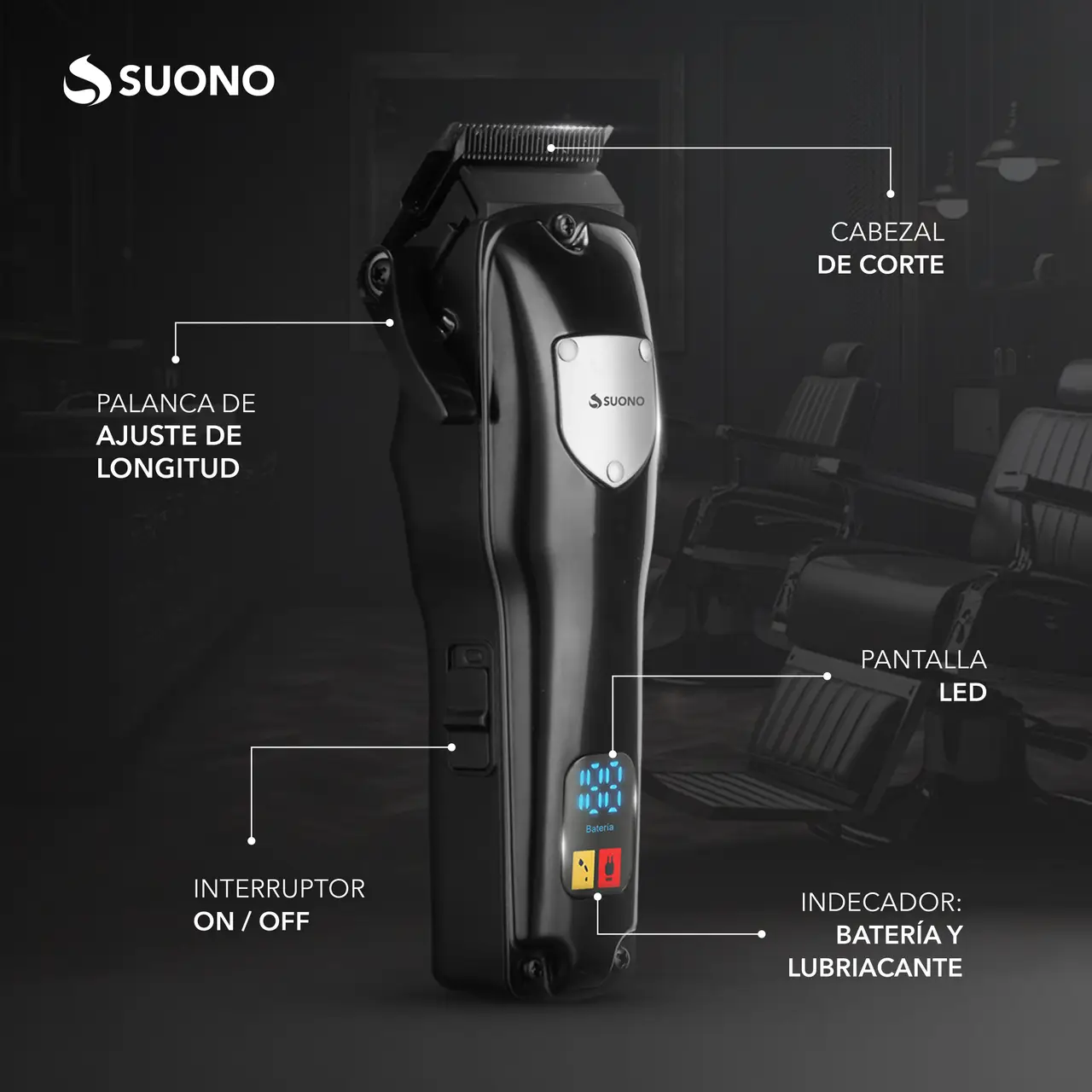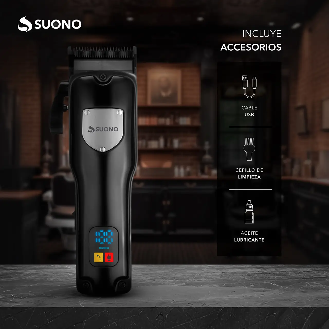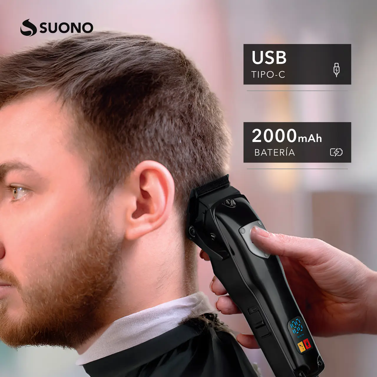 Máquina cortapelos con pantalla LED y cuchillas de acero inoxidable. Incluye peines guía y batería recargable.
