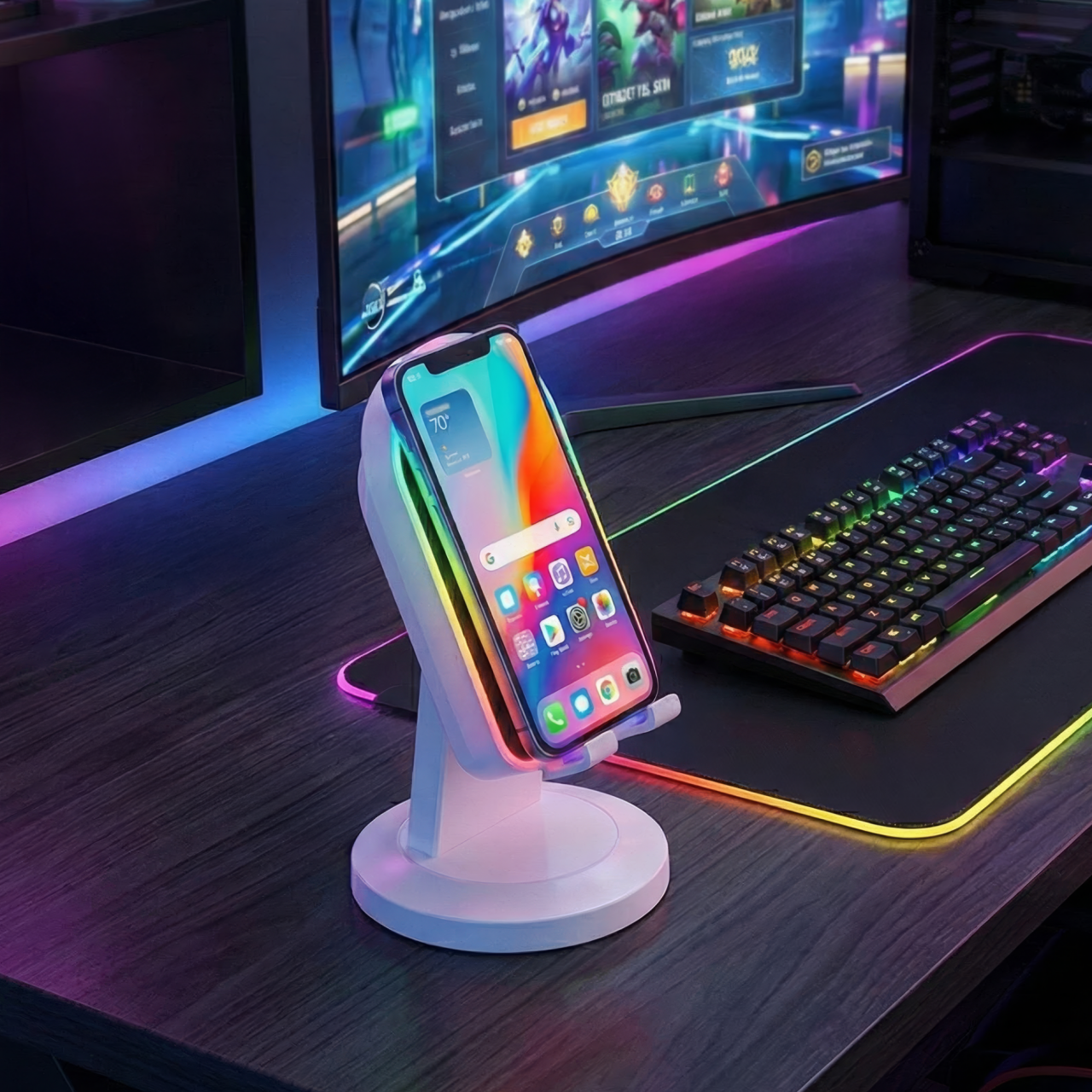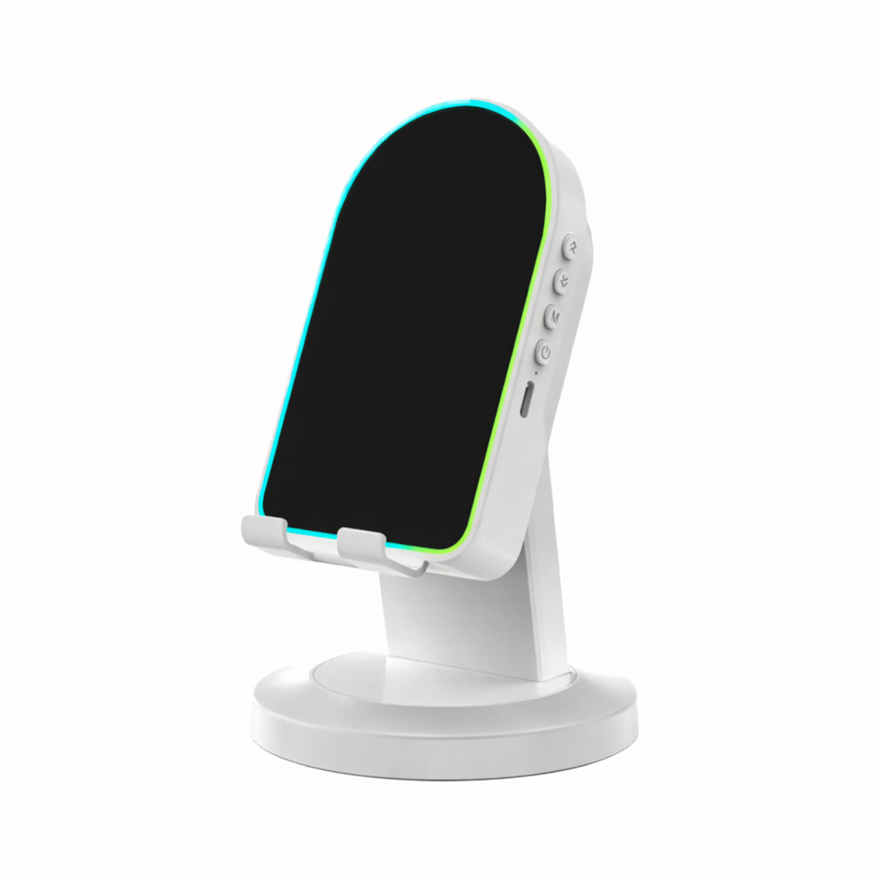 Soporte para celular con parlante integrado. Ideal para escritorio o entretenimiento.