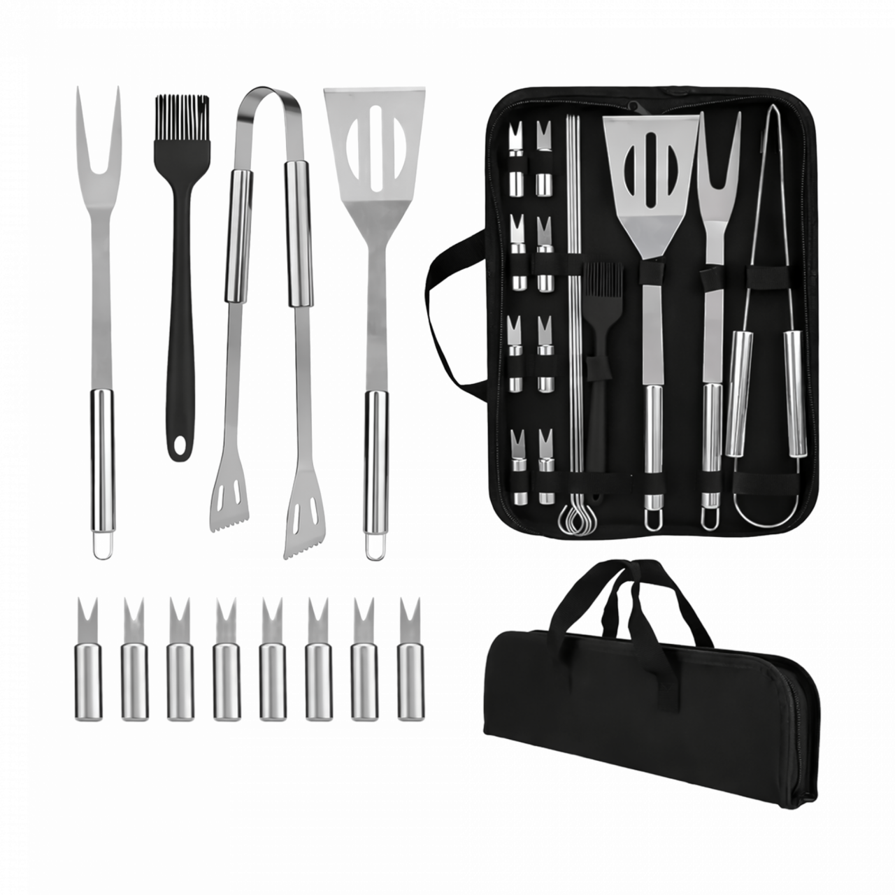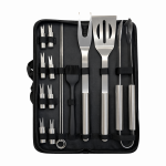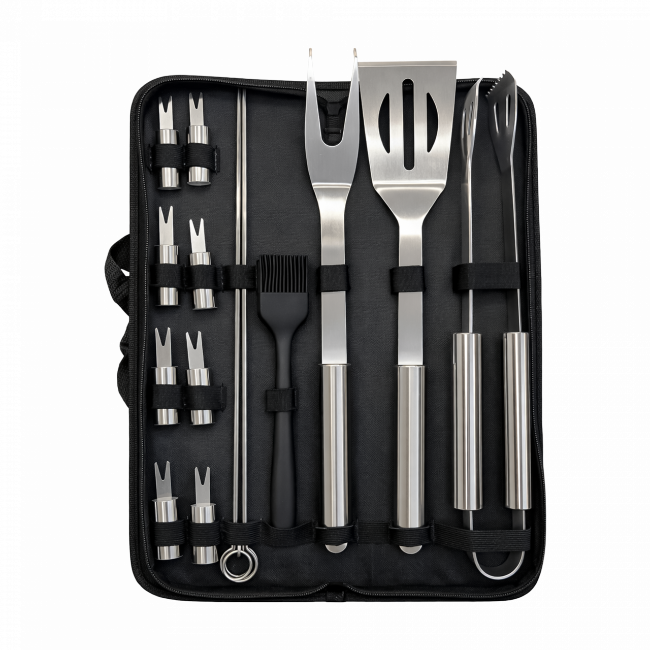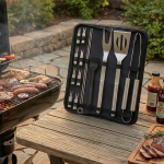 Kit parrillero de 11 piezas en acero. Incluye utensilios esenciales para asados y parrilla.