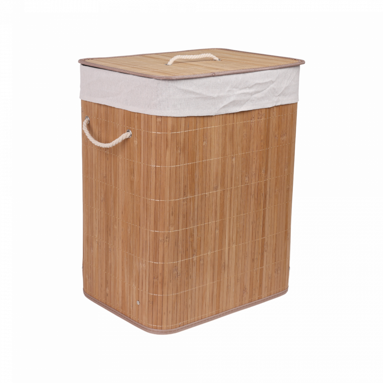 Exterior de madera de bambú con cubierta interna de tela Incluye tapa y manijas estéticas de soga Diseño rectangular