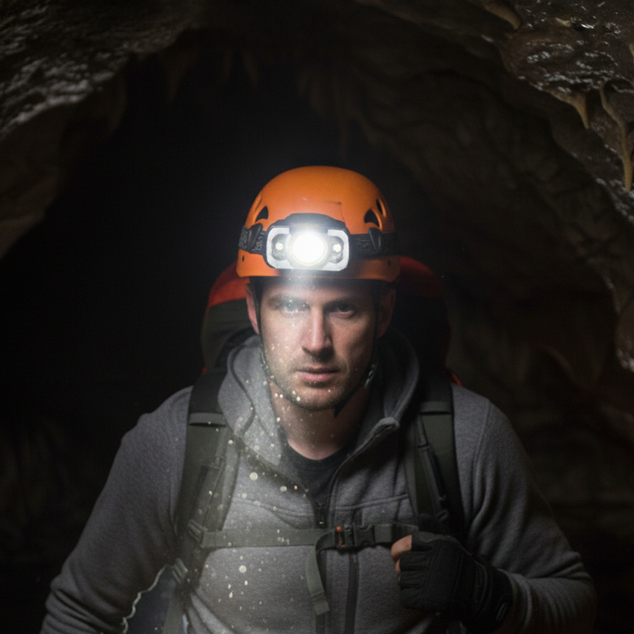 Linterna frontal LED con sensor y carga USB-C. Ideal para trabajo nocturno o camping.