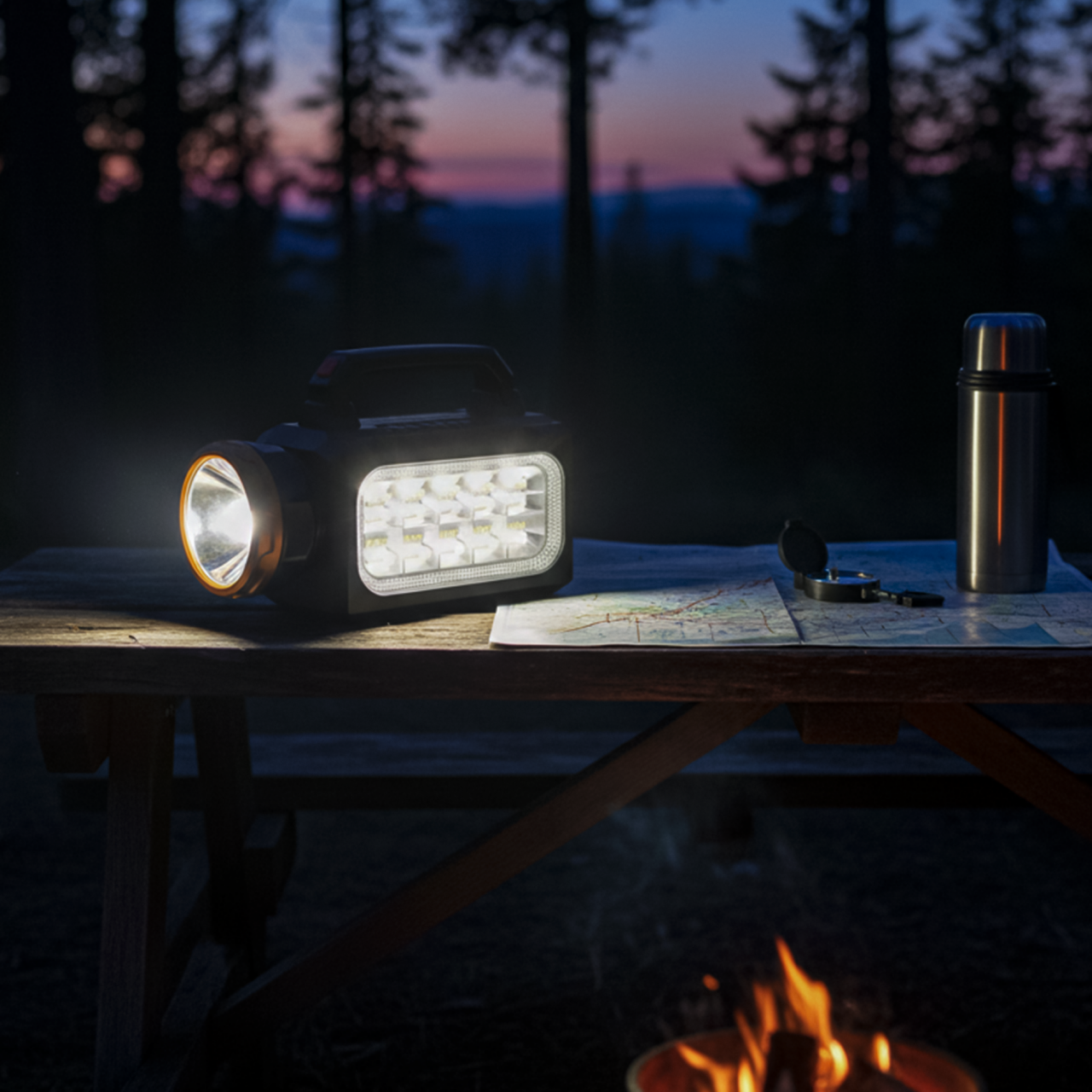 Linterna portátil recargable. Ofrece iluminación práctica para actividades al aire libre.