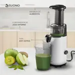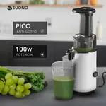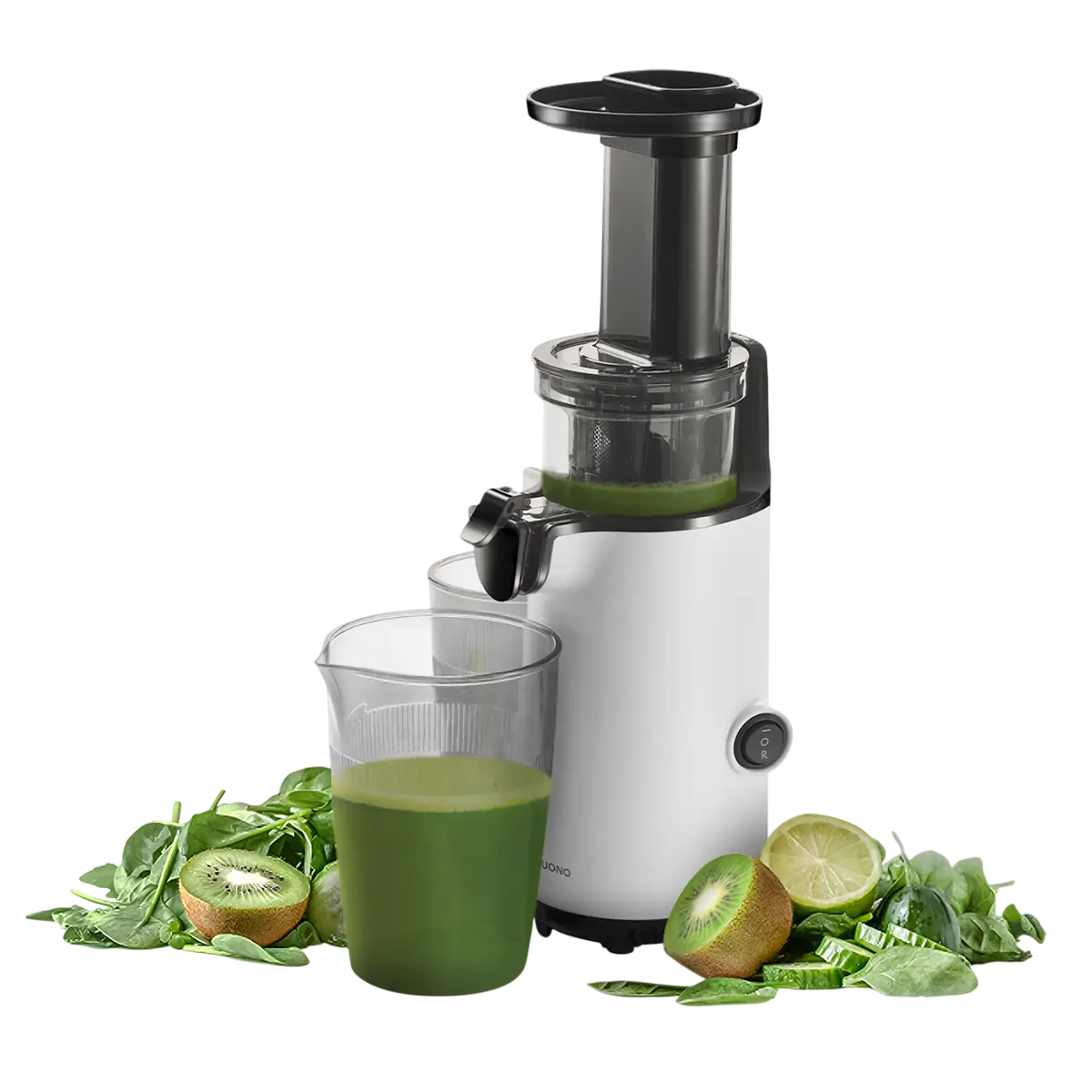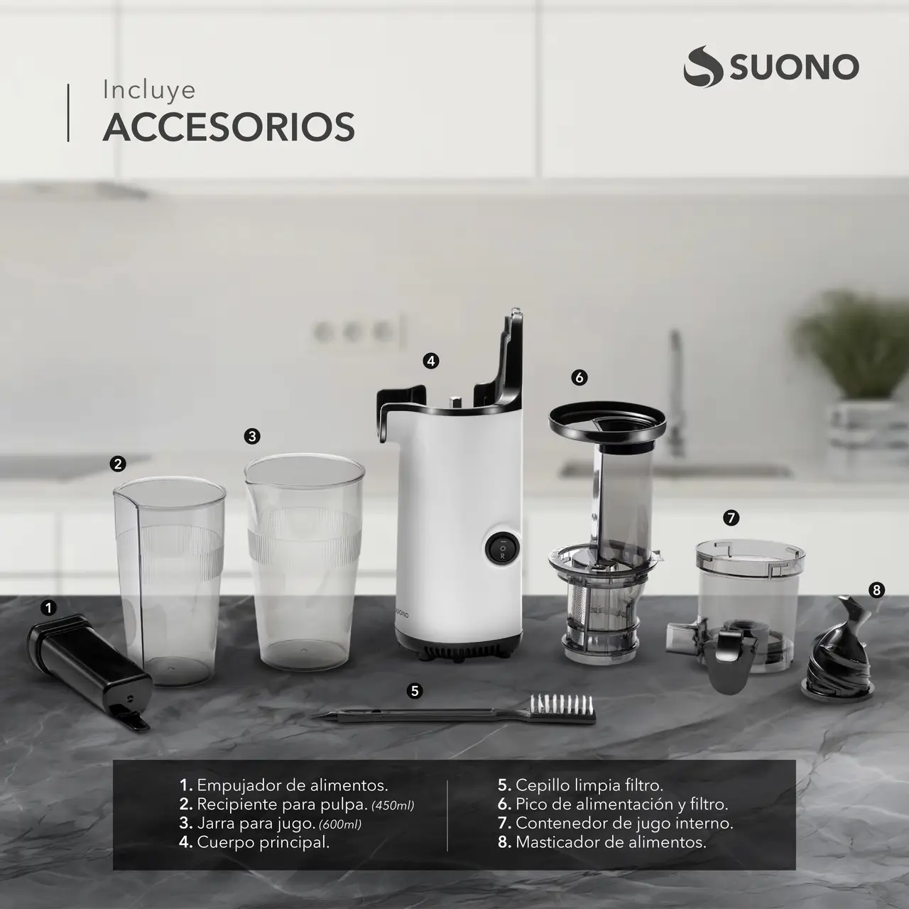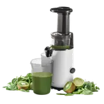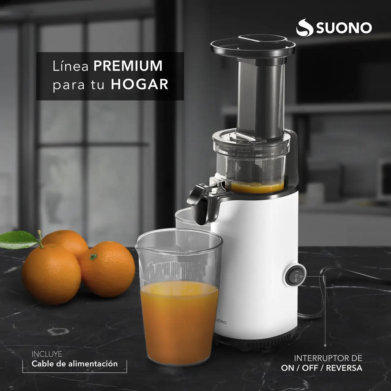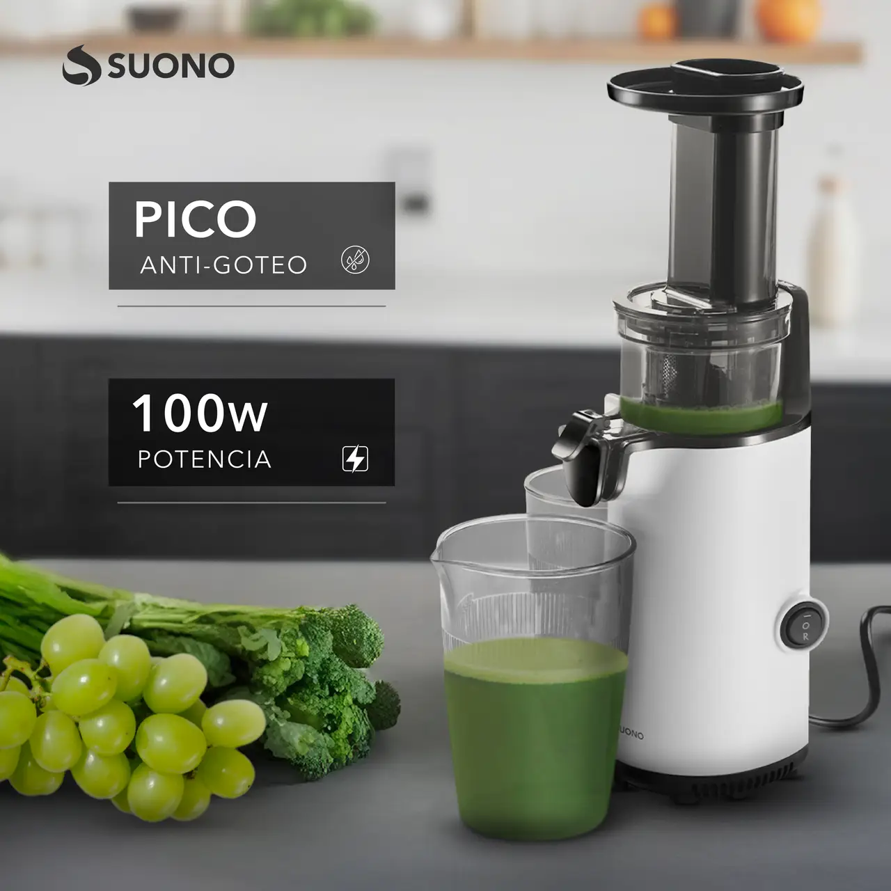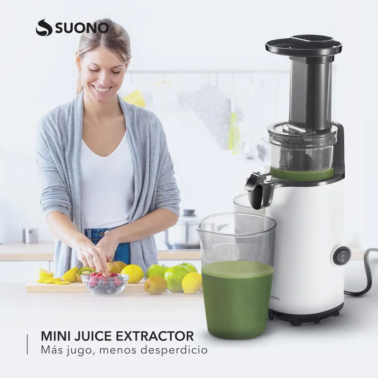 Juguera compacta de extracción lenta. Permite preparar jugos naturales conservando vitaminas y nutrientes.