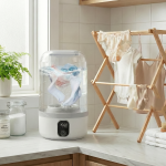 Mini lavarropas portátil inalámbrico ideal para ropa interior y prendas pequeñas. Funcionamiento con batería recargable.