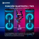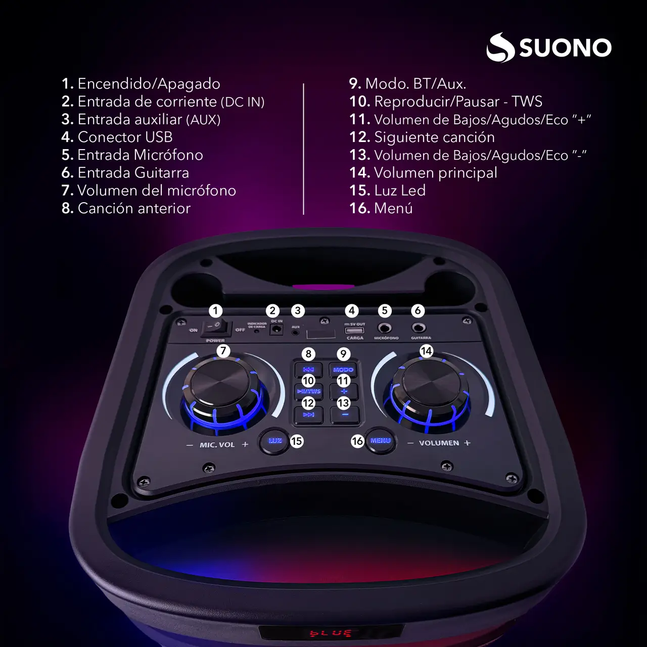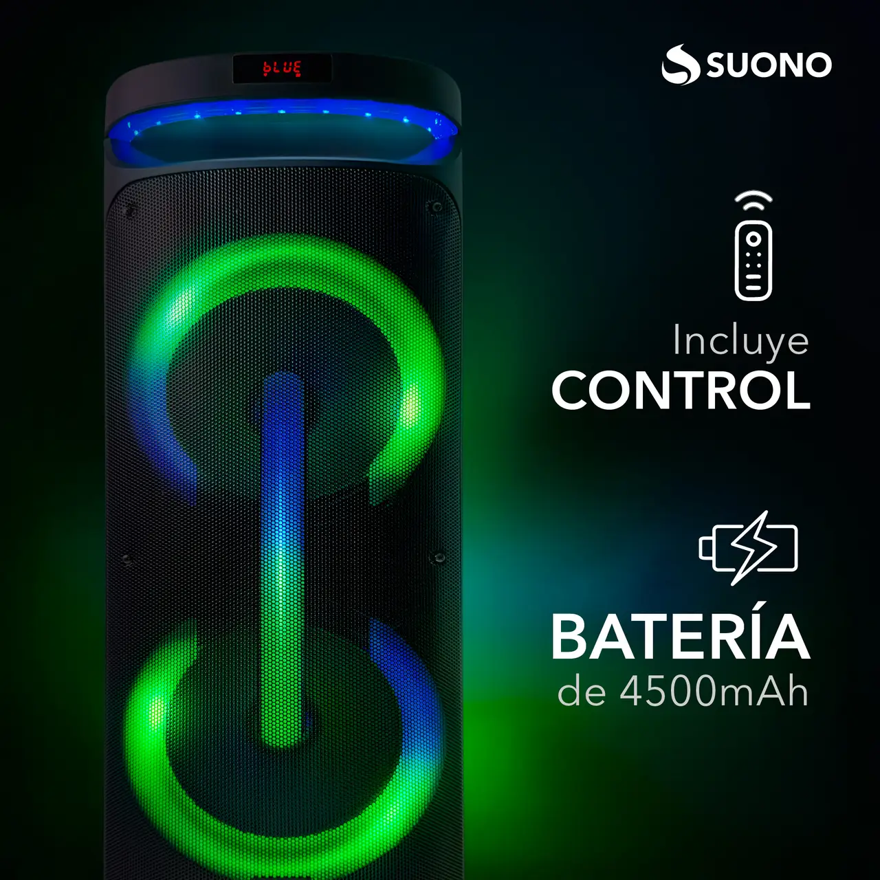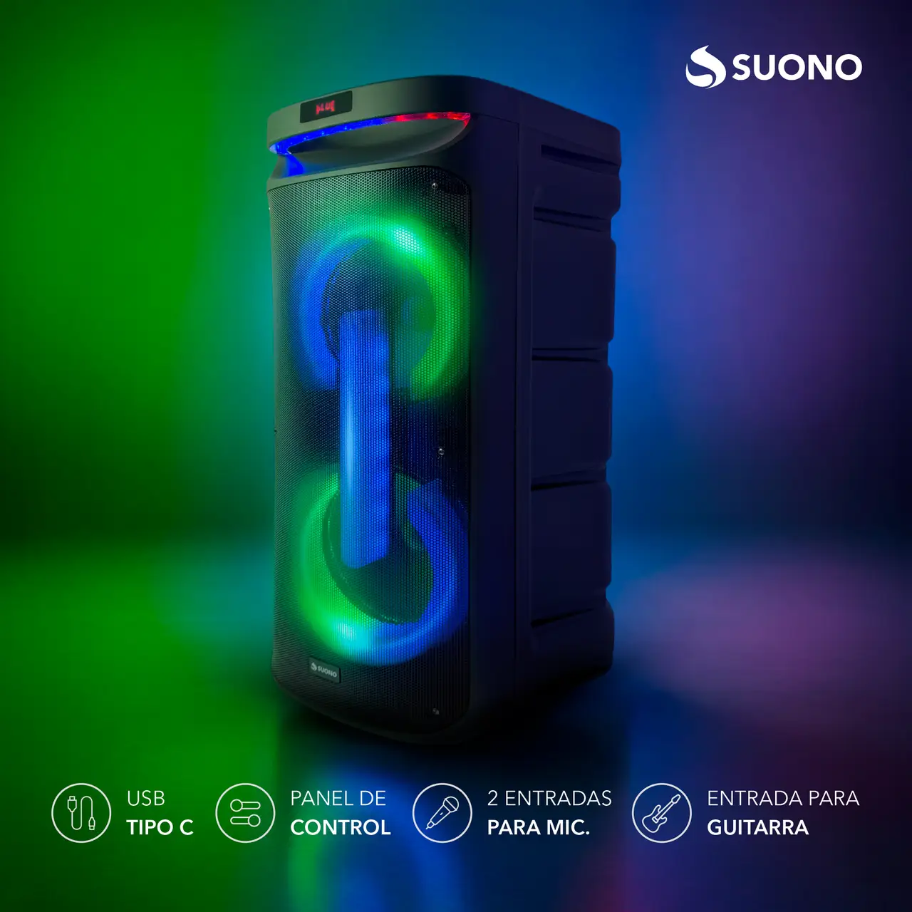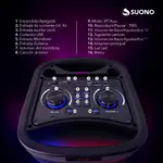 2 woofers de 10” + agudos tipo bocina (Con ruedas) 2 entradas para micrófono Gran pantalla LED
