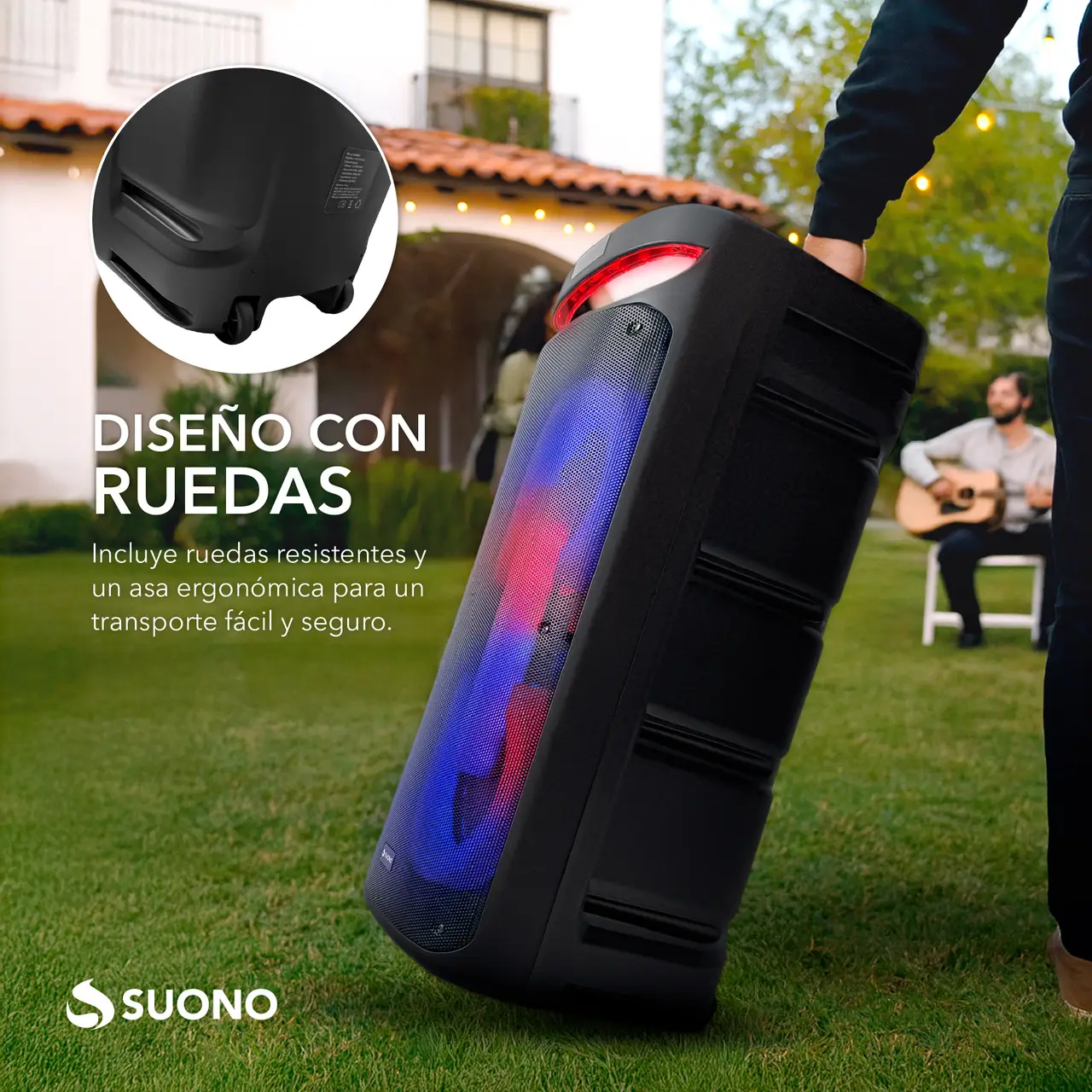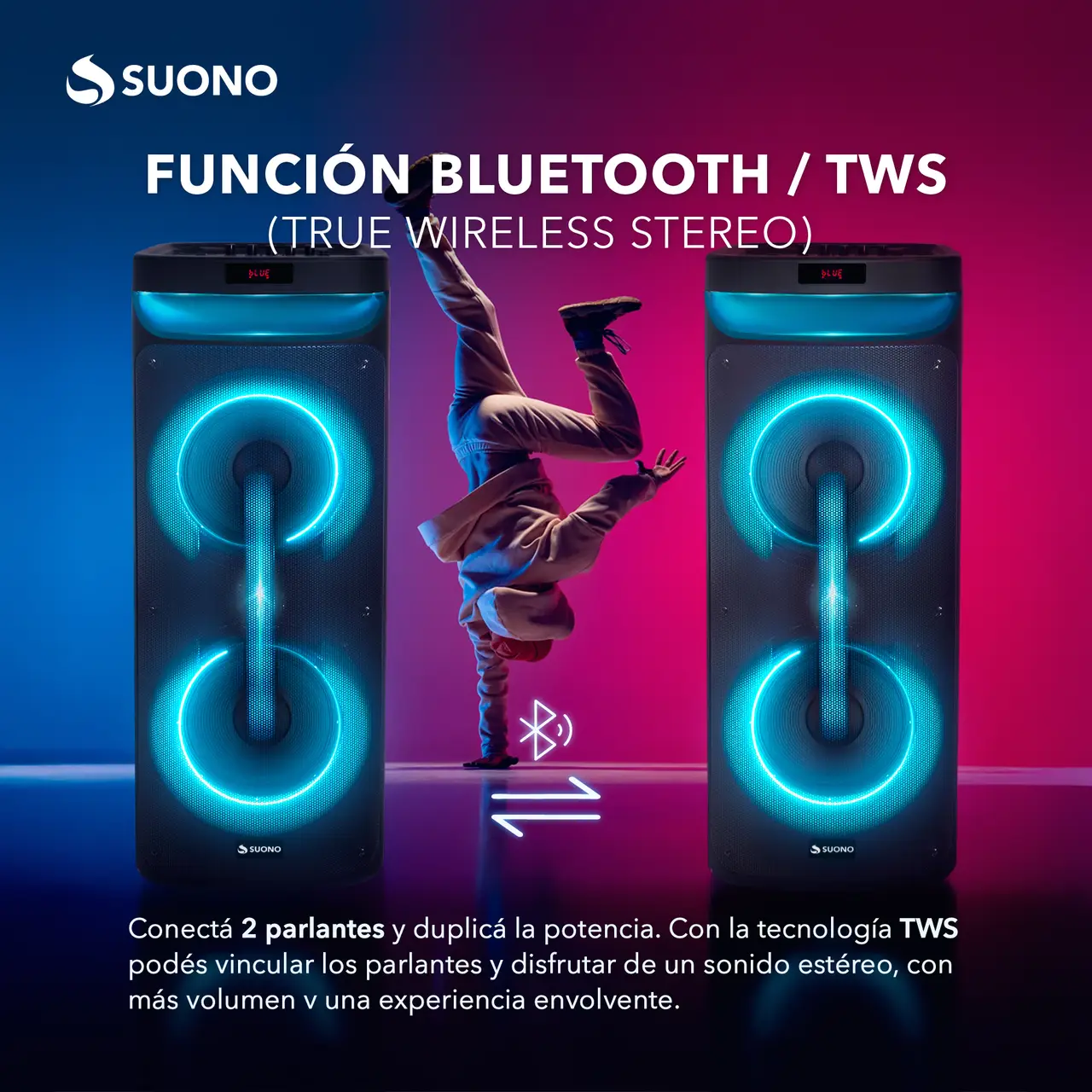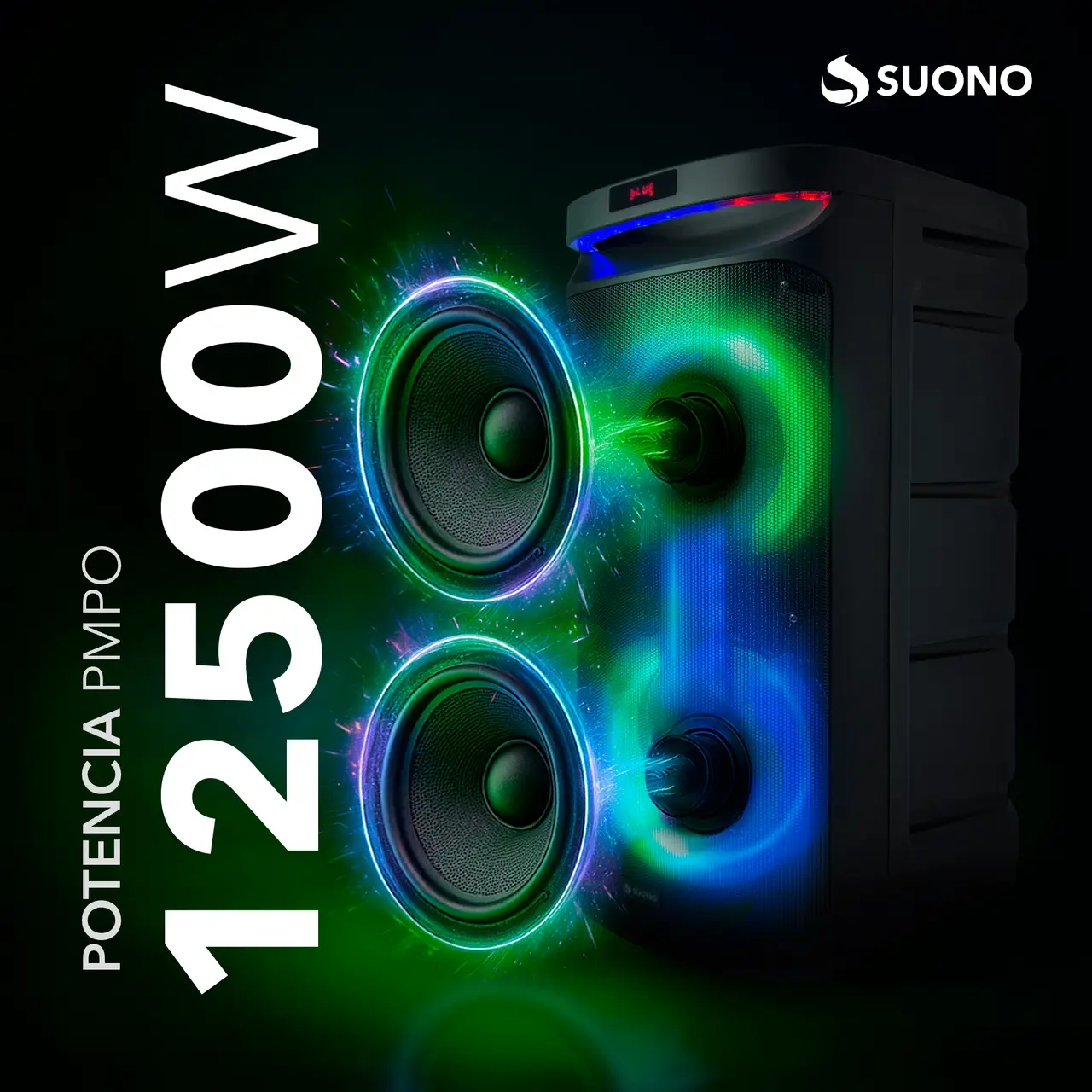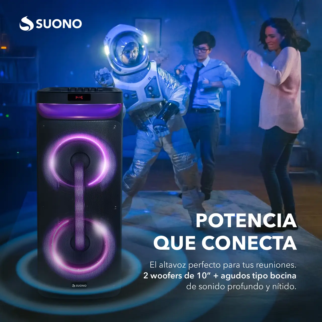 2 woofers de 10” + agudos tipo bocina (Con ruedas) 2 entradas para micrófono Gran pantalla LED