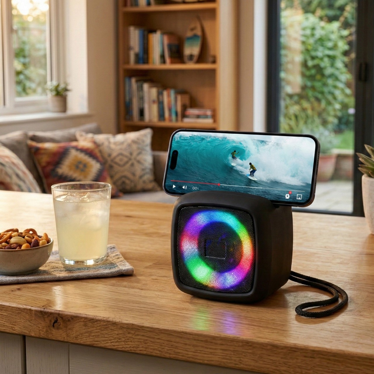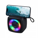 Parlante con conectividad Bluetooth 5.3, USB, AUX, tarjeta de memoria y radio FM, batería de 1200 mAh con hasta 5 horas de reproducción, micrófono para manos libres, luces LED configurables, ranura para celular y alcance de 10 m.
