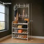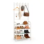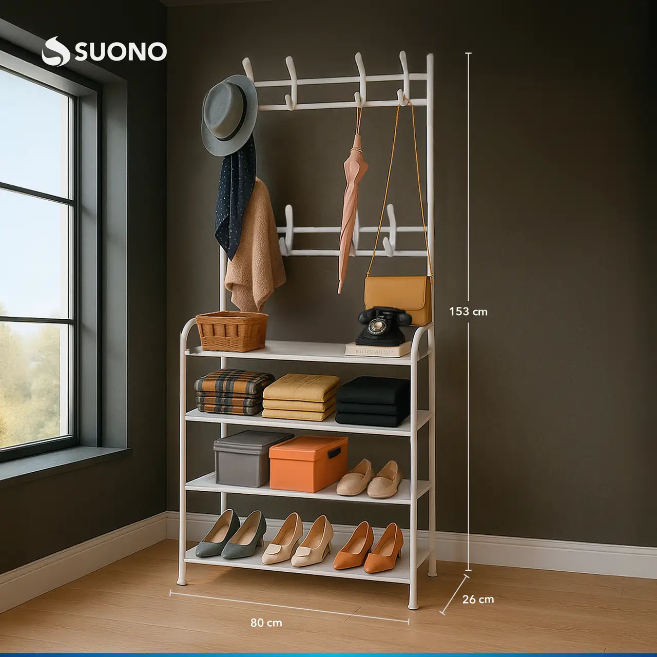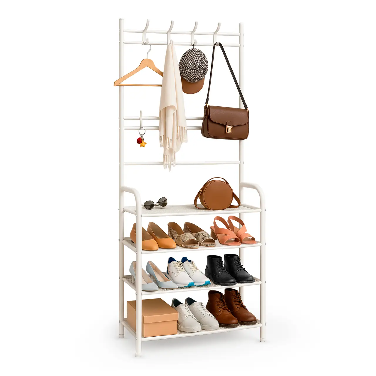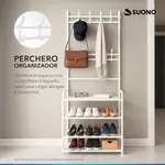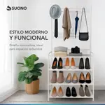 Perchero organizador con zapatero de 4 niveles ideal para ordenar ropa y calzado.