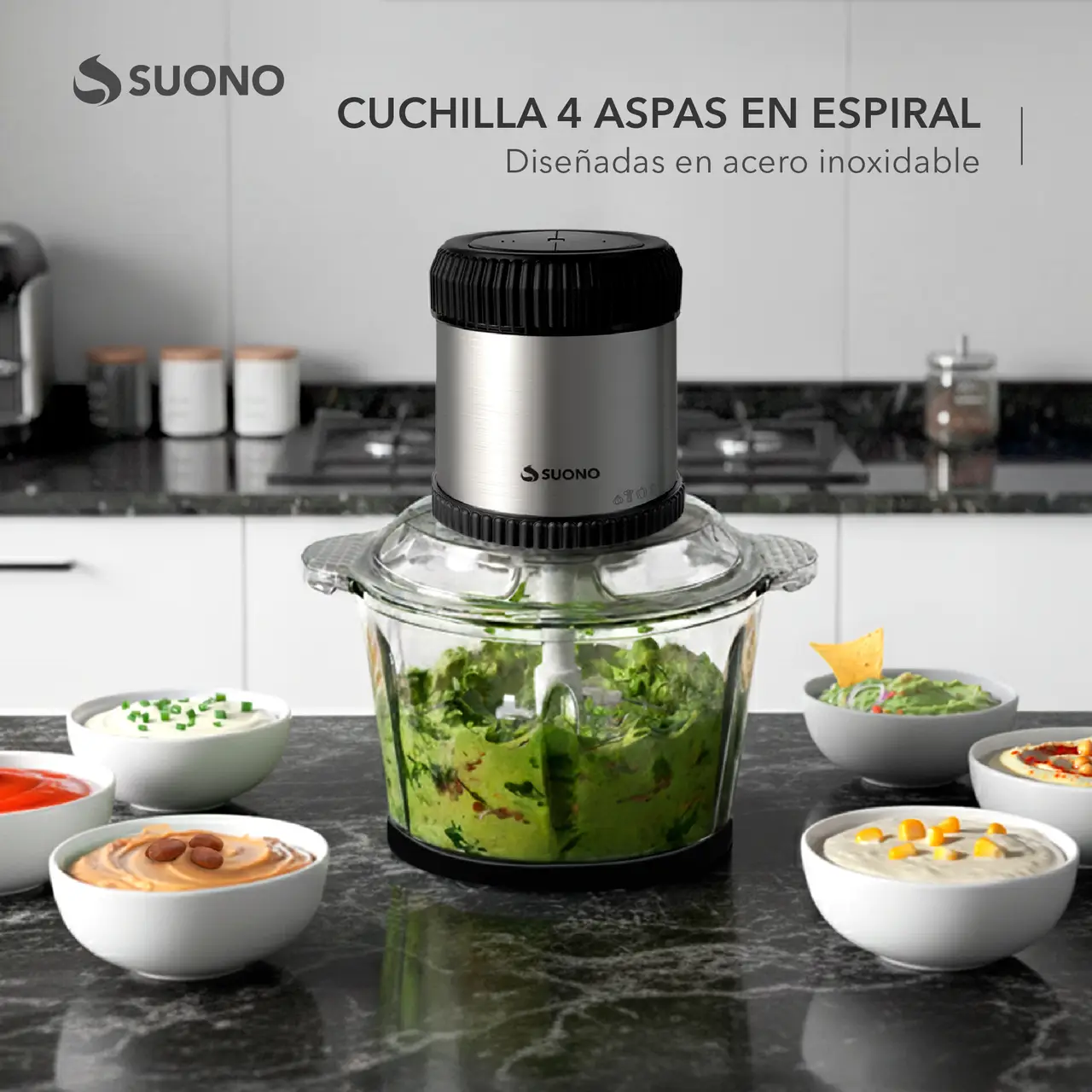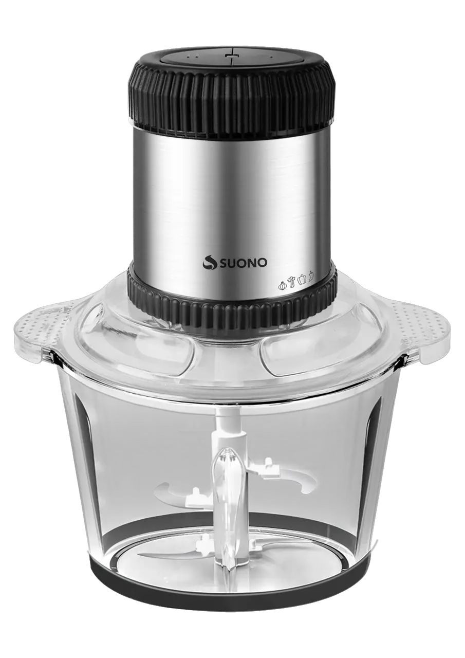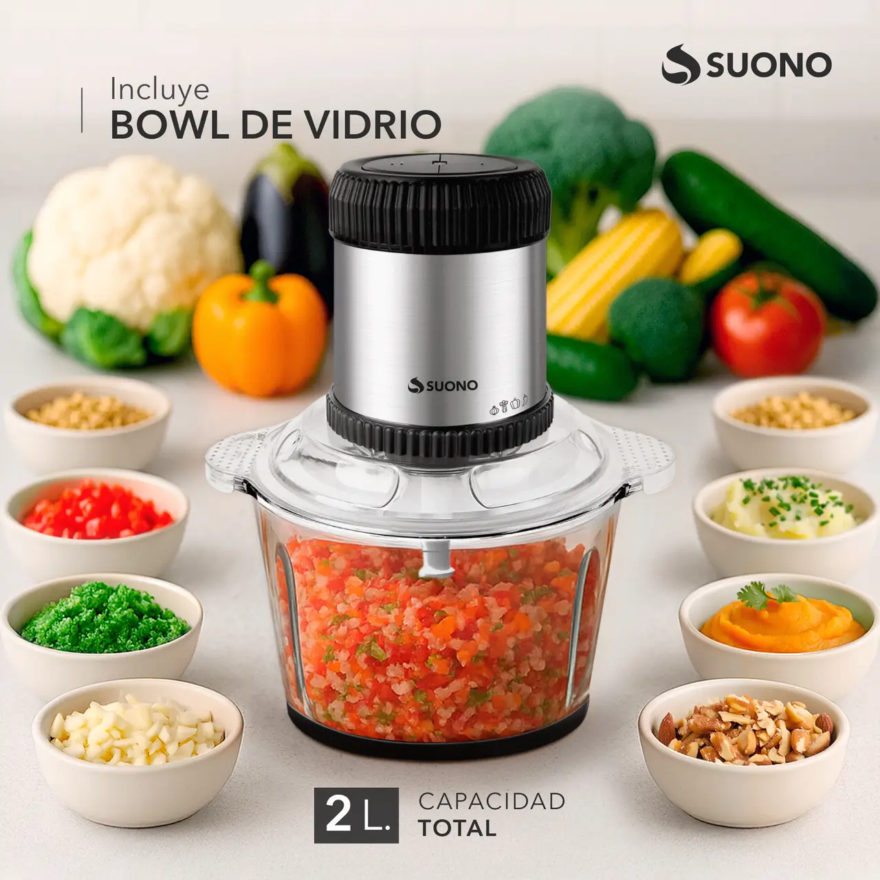 Picadora eléctrica con bowl de vidrio de 2 litros y cuchilla de acero inoxidable de 4 aspas.