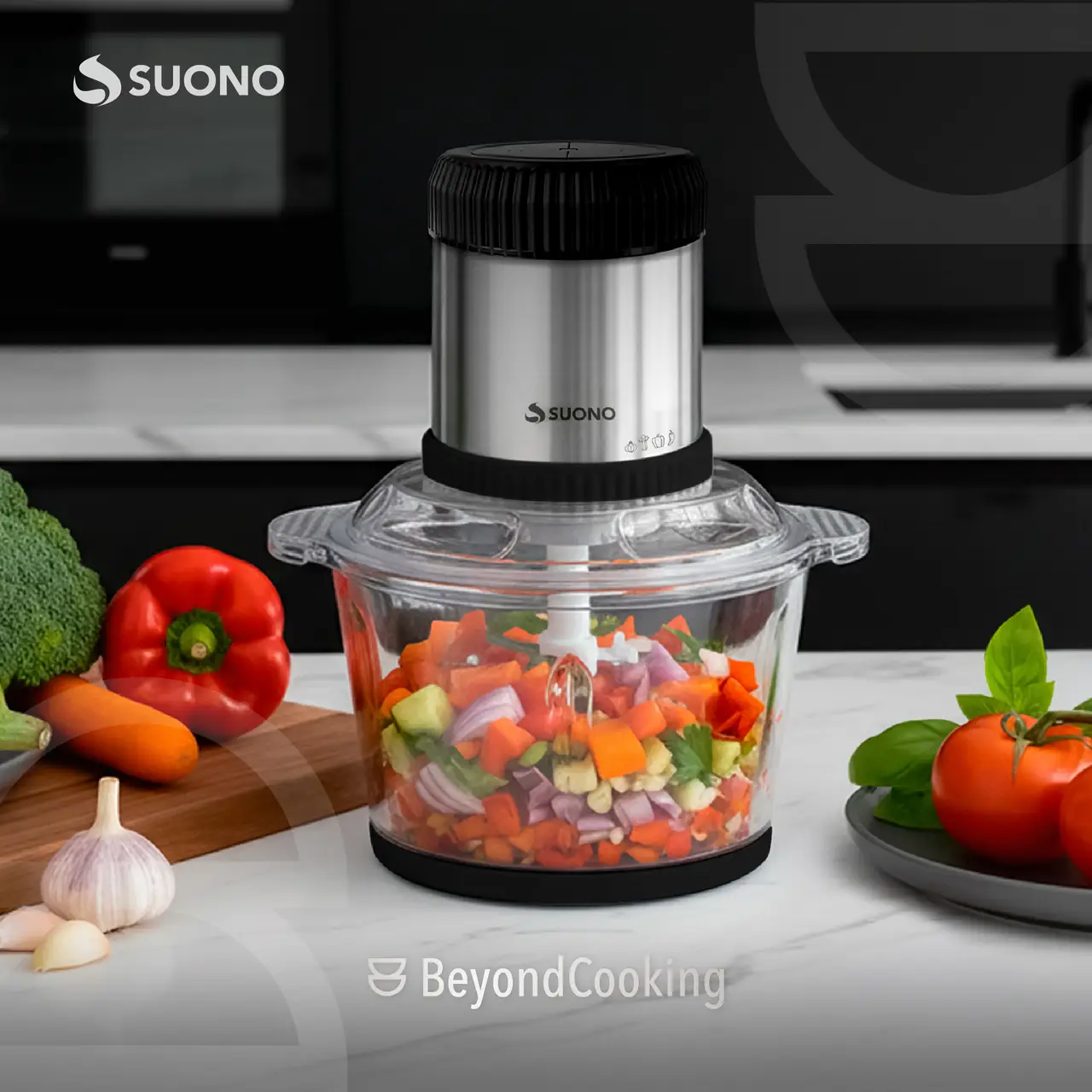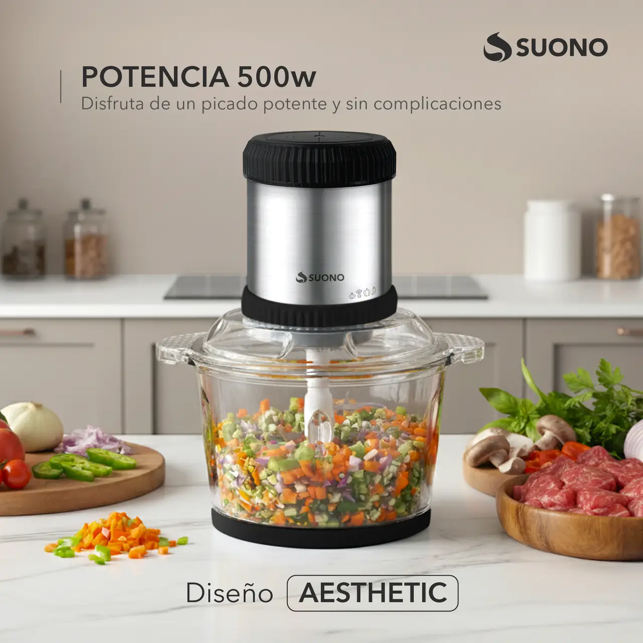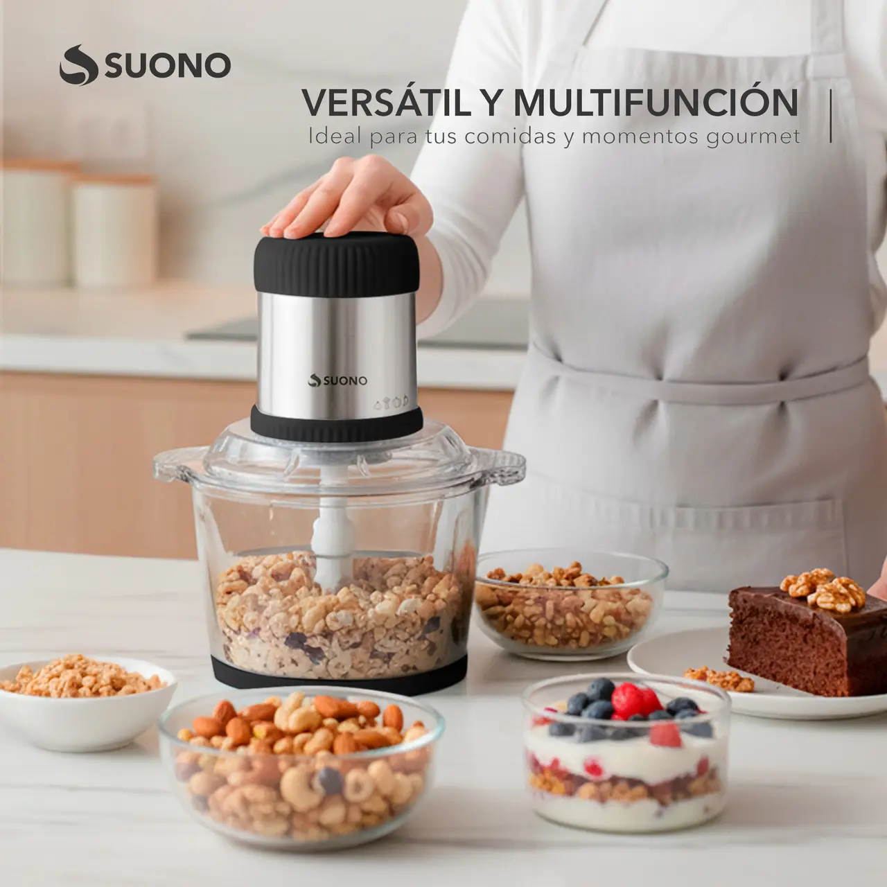 Picadora eléctrica con bowl de vidrio de 2 litros y cuchilla de acero inoxidable de 4 aspas.