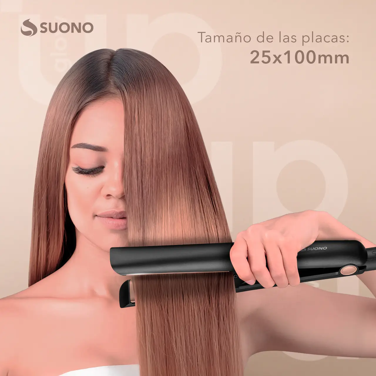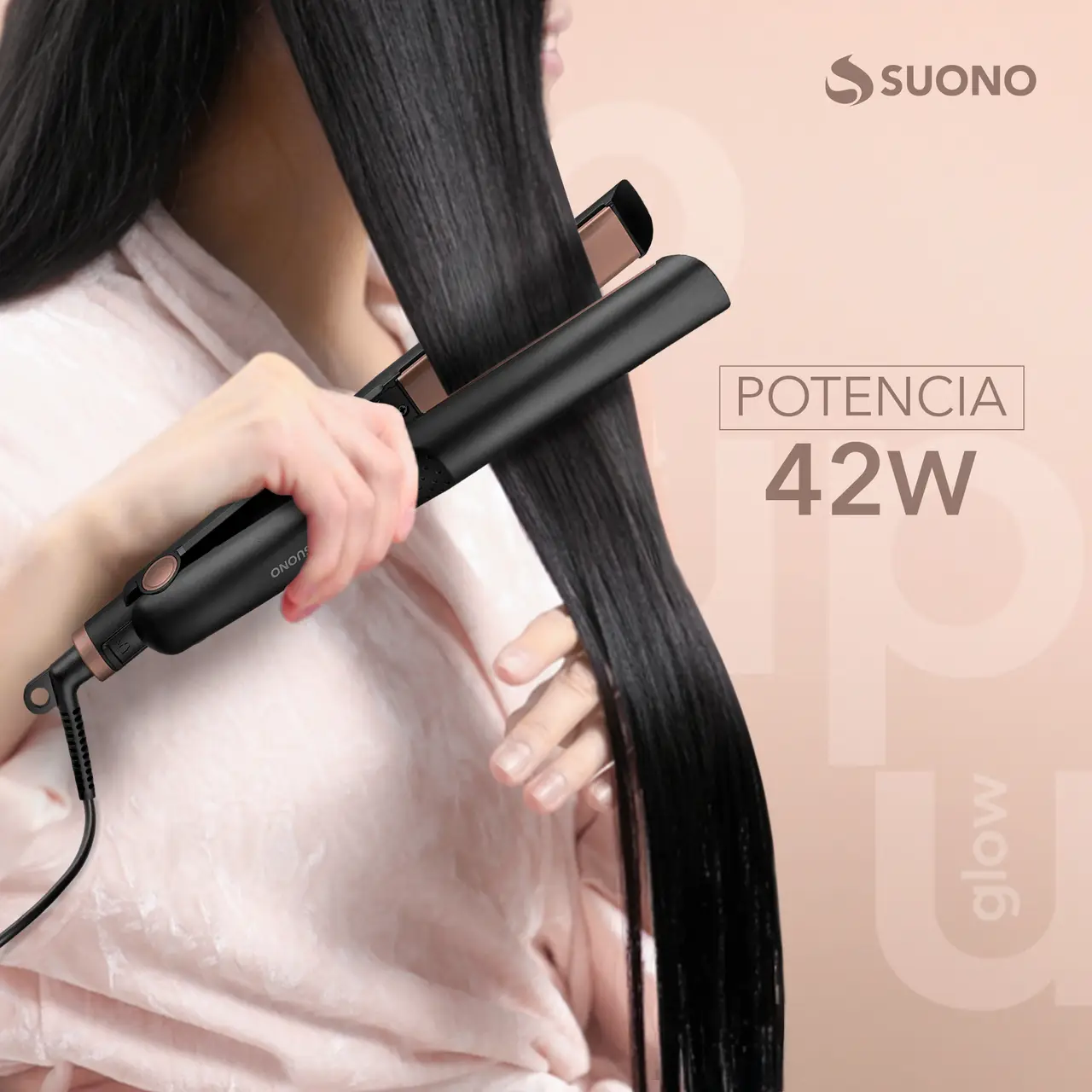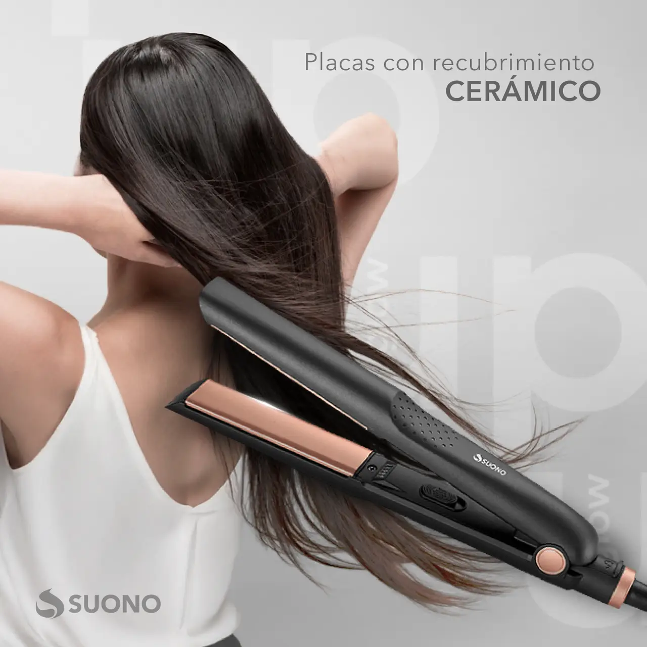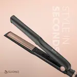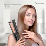Plancha de cabello Suono con placas cerámicas, diseño ergonómico y cable giratorio 360°.