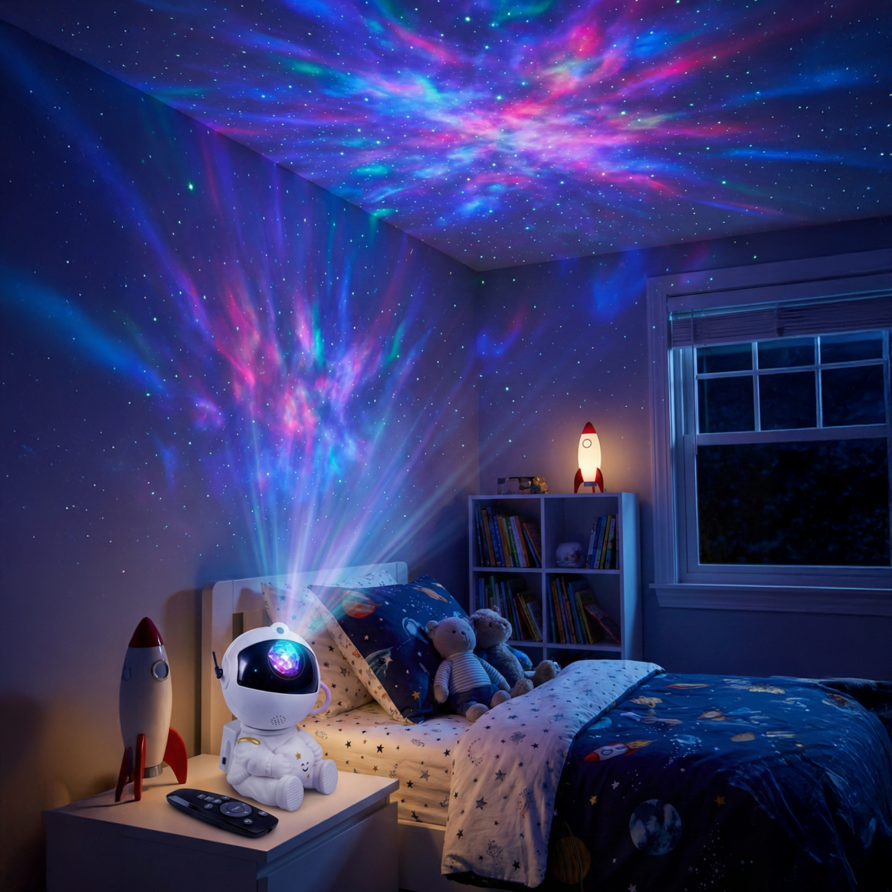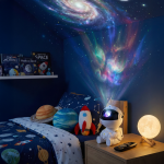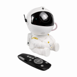 Proyector con forma de astronauta con 8 efectos de nebulosa y estrellas. Brillo y velocidad ajustables. Proyección 360° con temporizador de 40 o 90 minutos y control remoto.